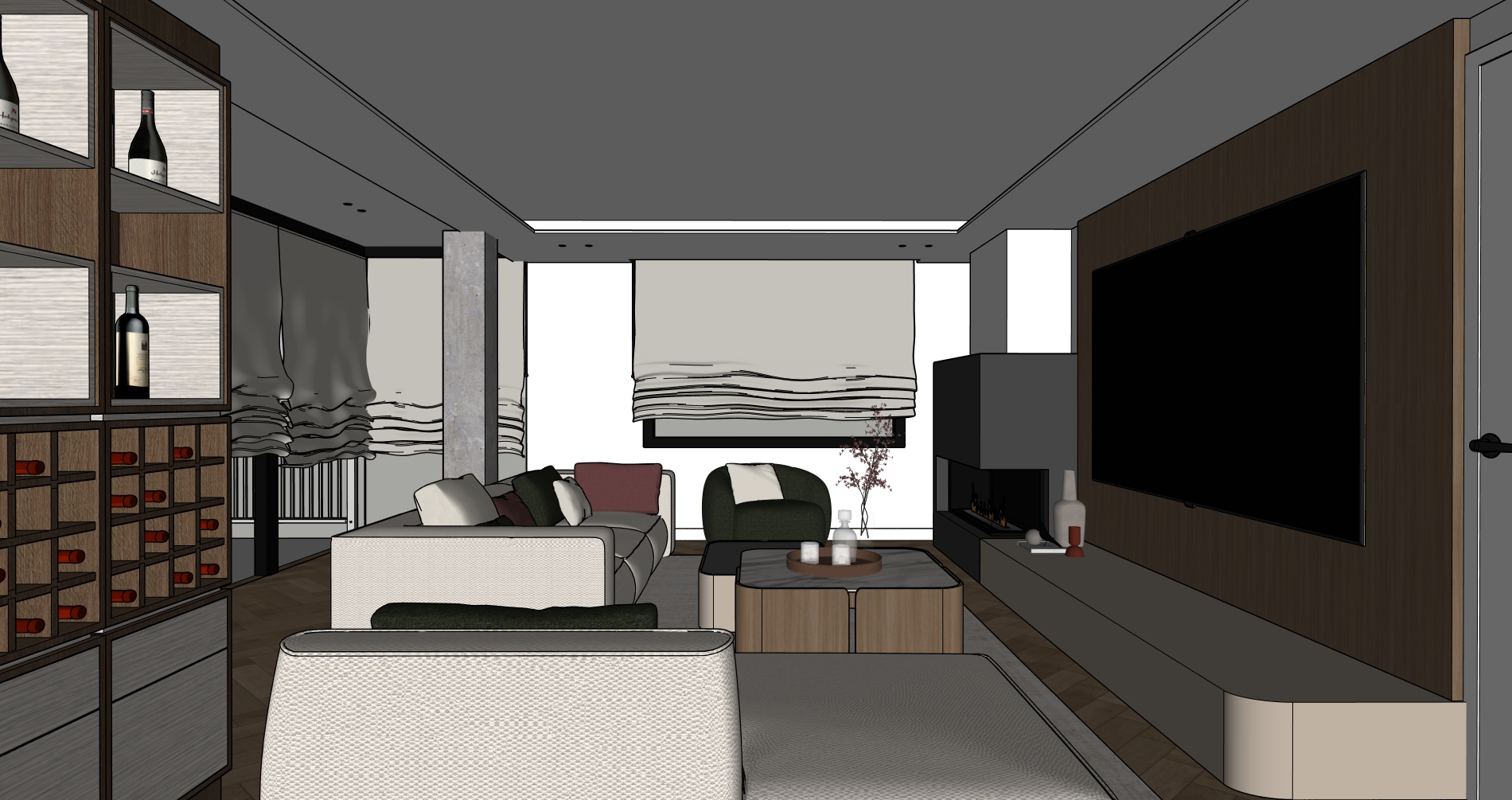 crea una imagen fotorealista a partir de este sketchup realza las texturas e iluminacion a ade i uminacion perimetral en el foseado del techo no tan intensa