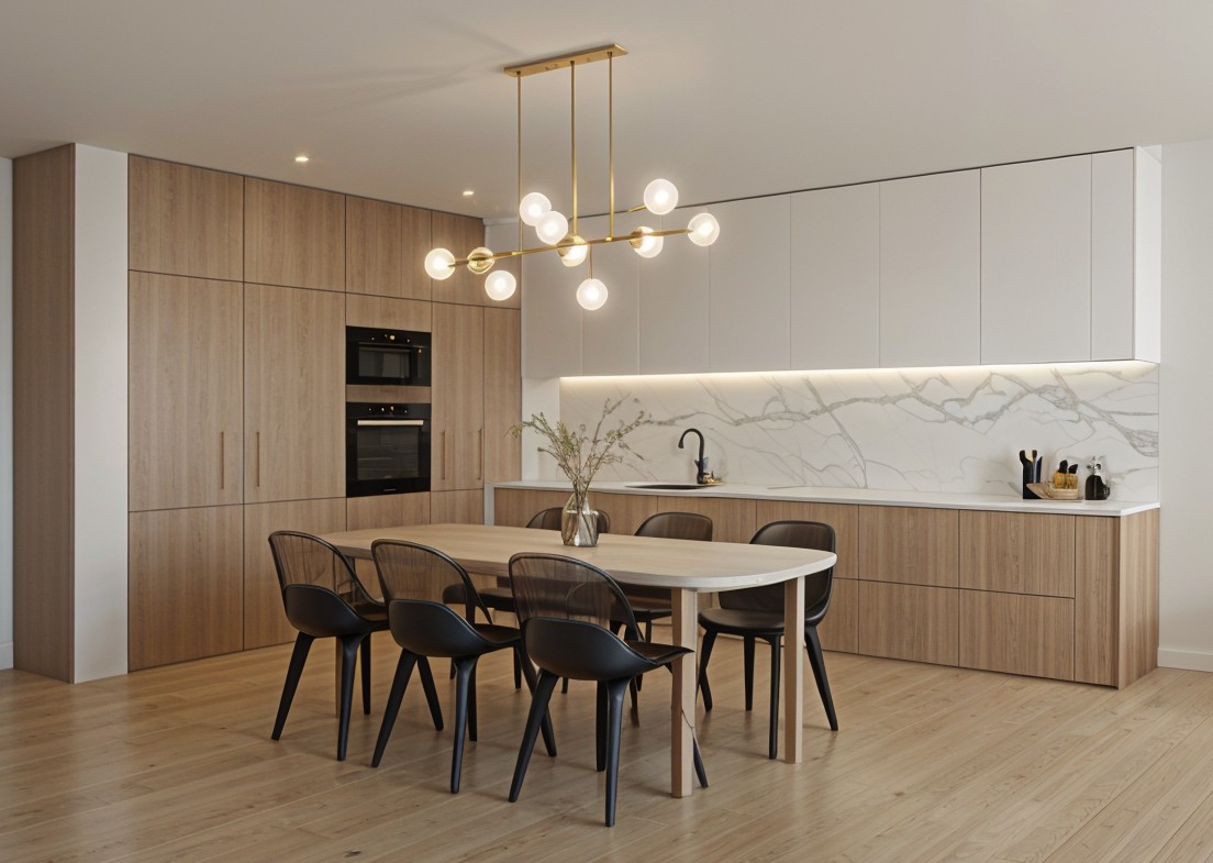 insted of table with chairs put kitchen island and nice lightning as well as accessories