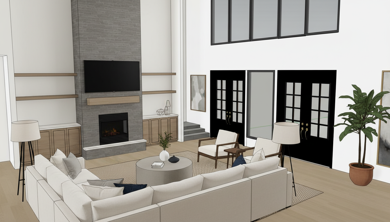 wall color sw alabaster white brick on fireplace stack add landscaping