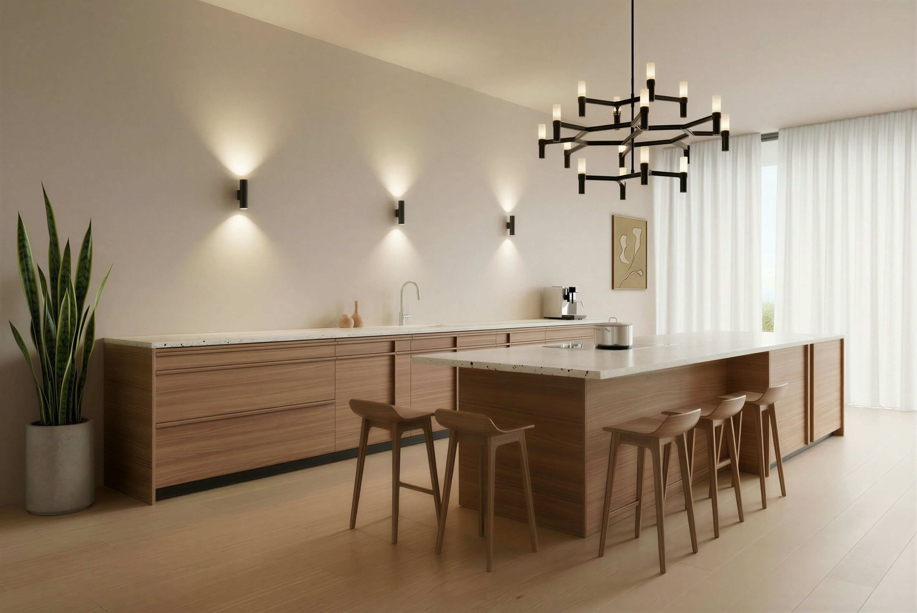 enhance this image to ultra photorealistic quality preserve the exact geometry proportions layout materials colors textures and all design details exactly as shown do not add remove redesign restyle or reinterpret anything do not change materials colors lighting direction furniture dimensions or composition no new objects no decorative additions no artistic reinterpretation only improve realistic lighting natural shadows material realism true to life surface rendering reflections depth and camera realism high end architectural photography quality the final image must be a 1 1 faithful photorealistic version of the original design het enige wat je moet veranderen zijn de twee hoeken van het werkblad bij de barkrukken deze hoeken mogen afgerond worden met een radius van 200 mm