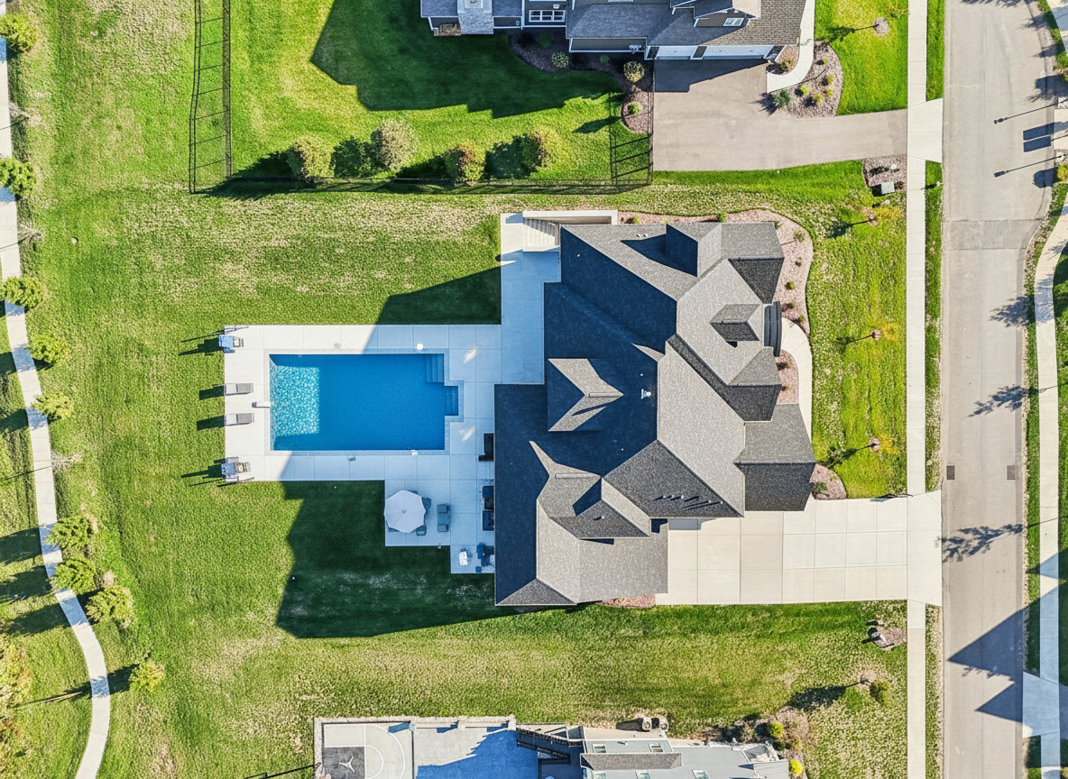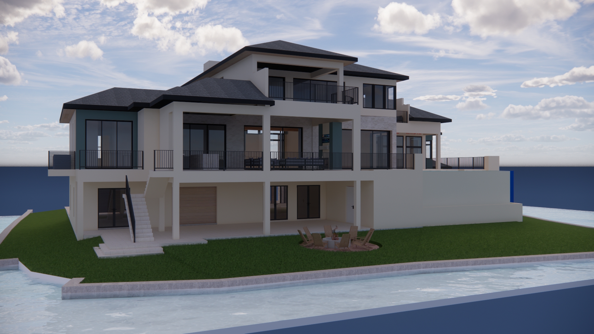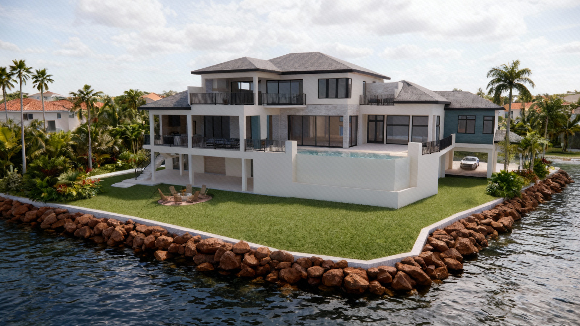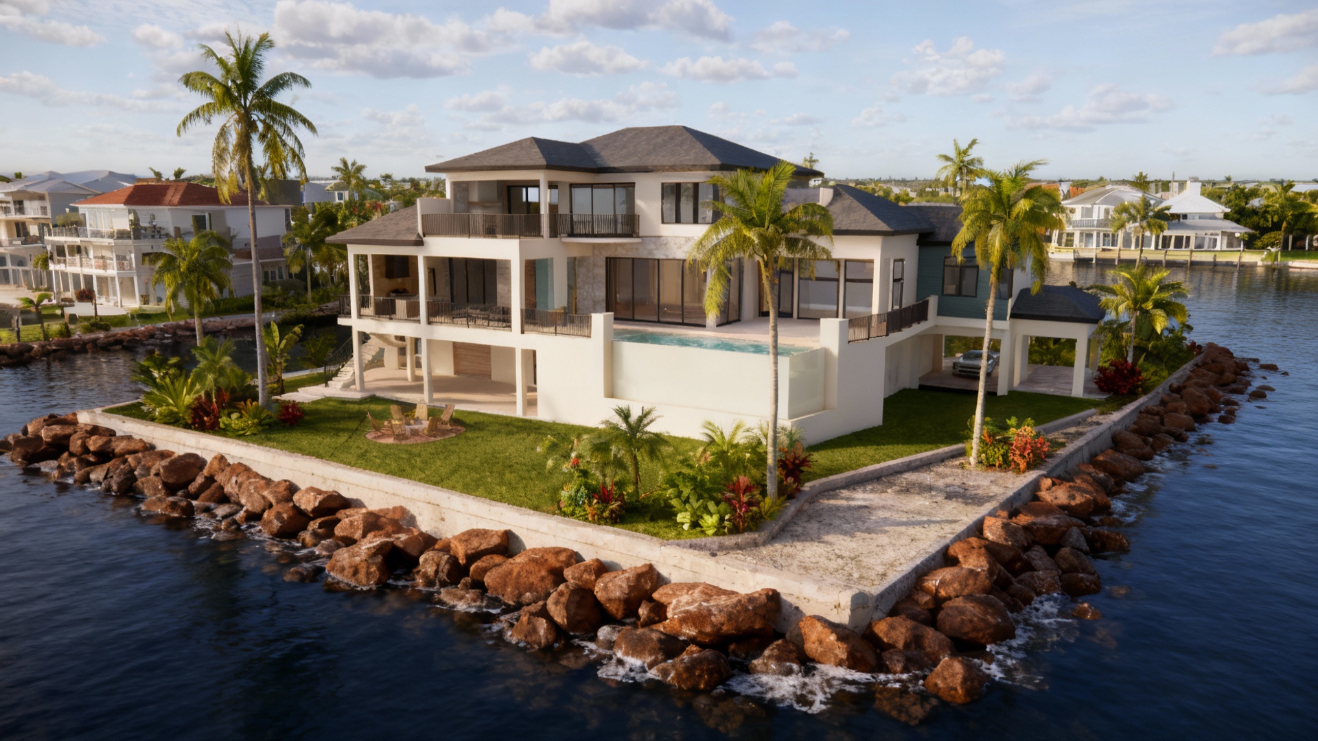 photo realistic florida scene of house with water on 3 sides in the grassy areas add palm trees and tropical plants in the background butnot the sides add other florida style homes the scene is midday with partly cloudy skies there are brown rocks along the edge of the seawall no water behind the house do not zoom out