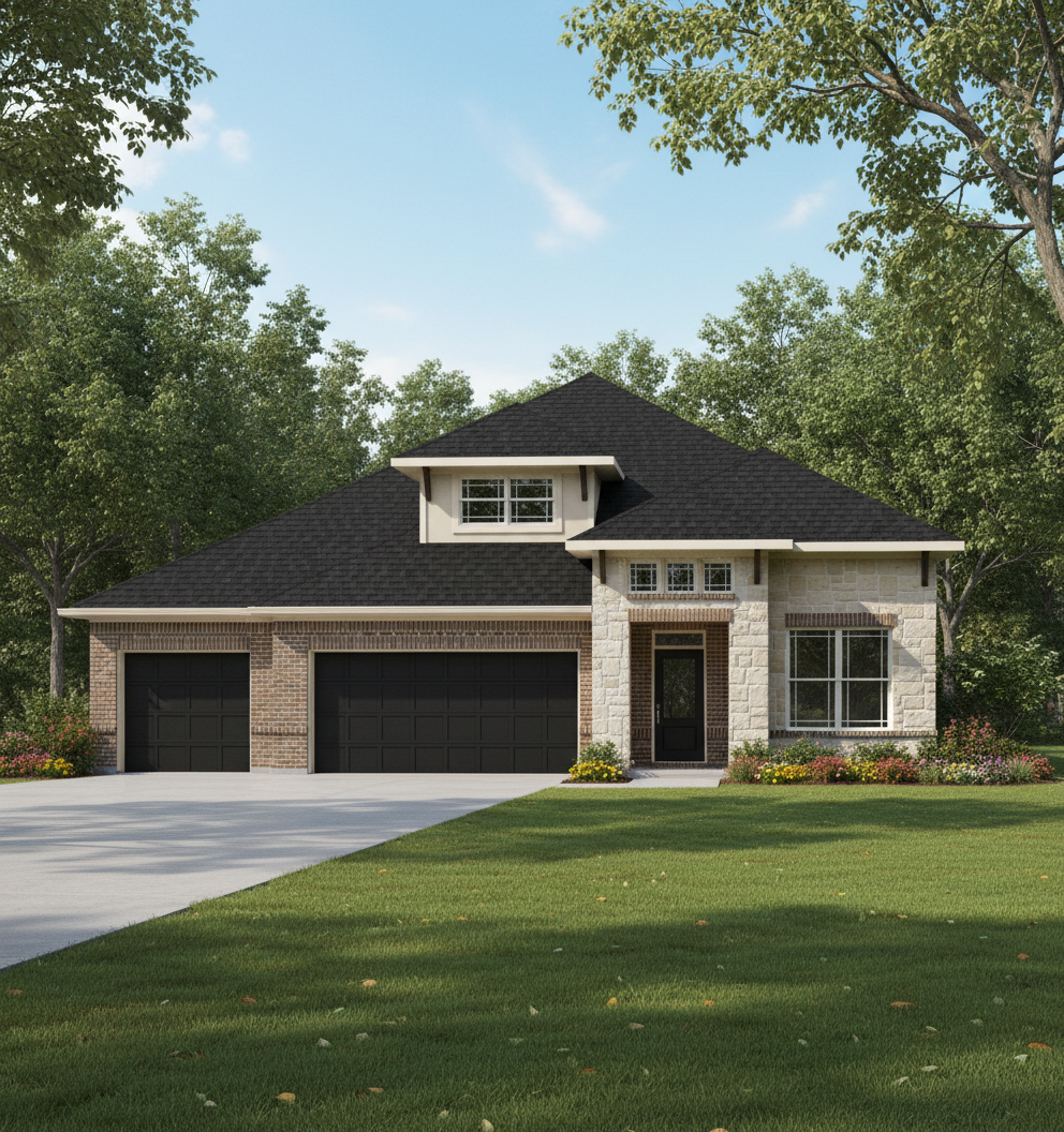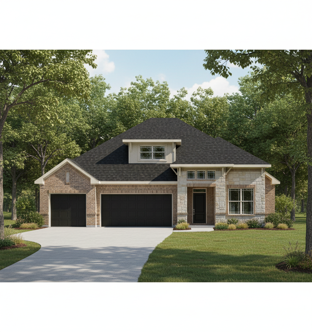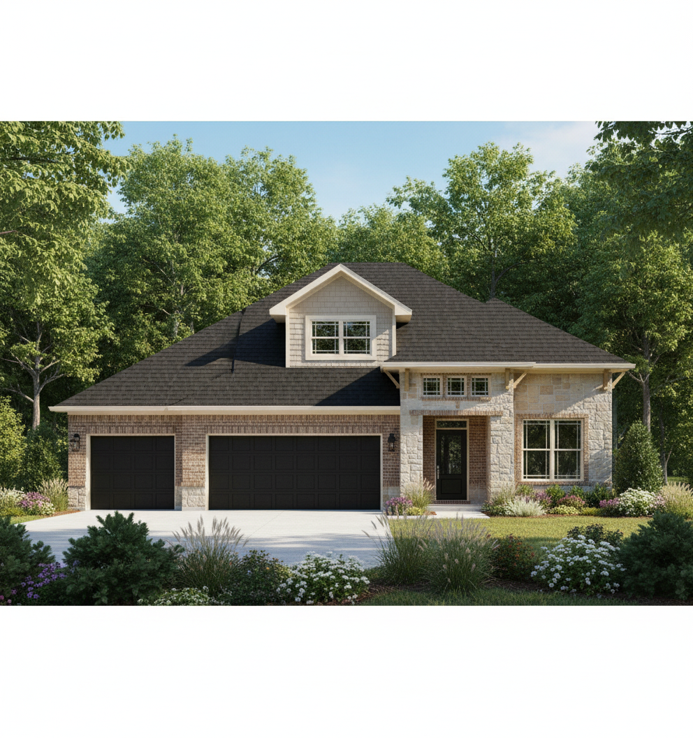 keep the elevation the same but make a realistic elevation of this homes on a wooded lot with landscaping that doesn t block the driveway on a sunny day make the roof doors and gutters black siding is sierra stone is sunset beige brick is country road trim is greek villa