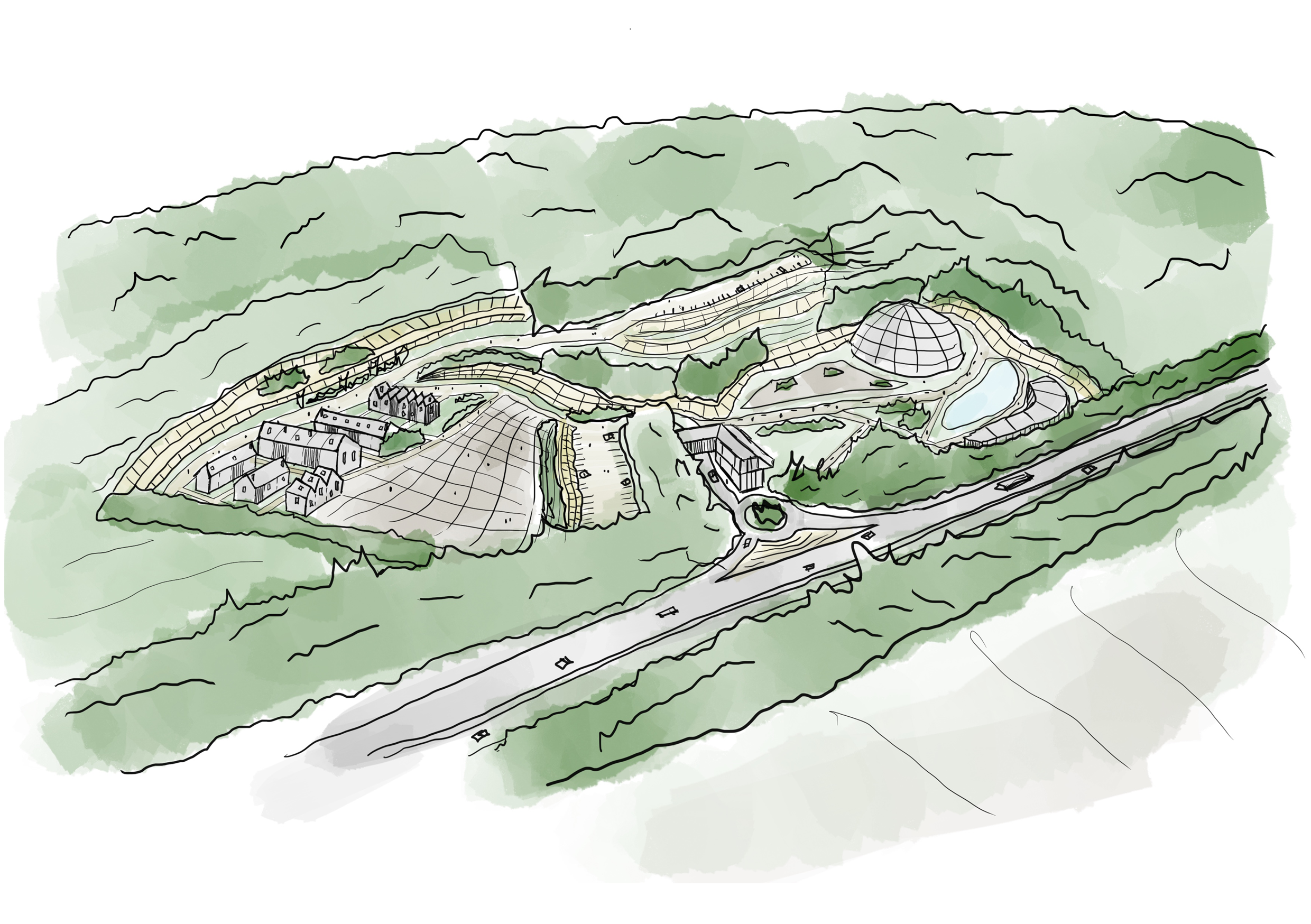 exterior shot sustainable eco village within an old quarry full of rich vegetation trees and landscaping contains zero carbon housing a biomes and a visitor centre