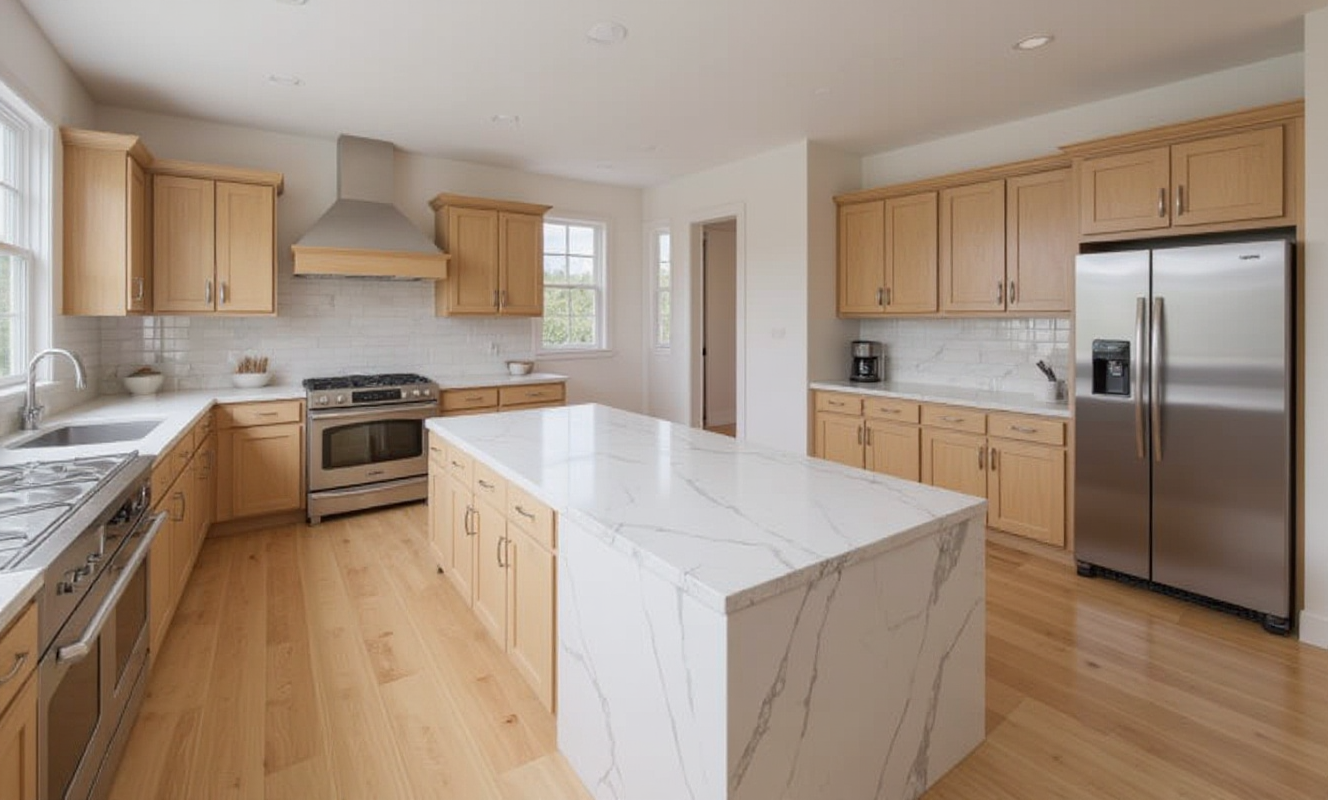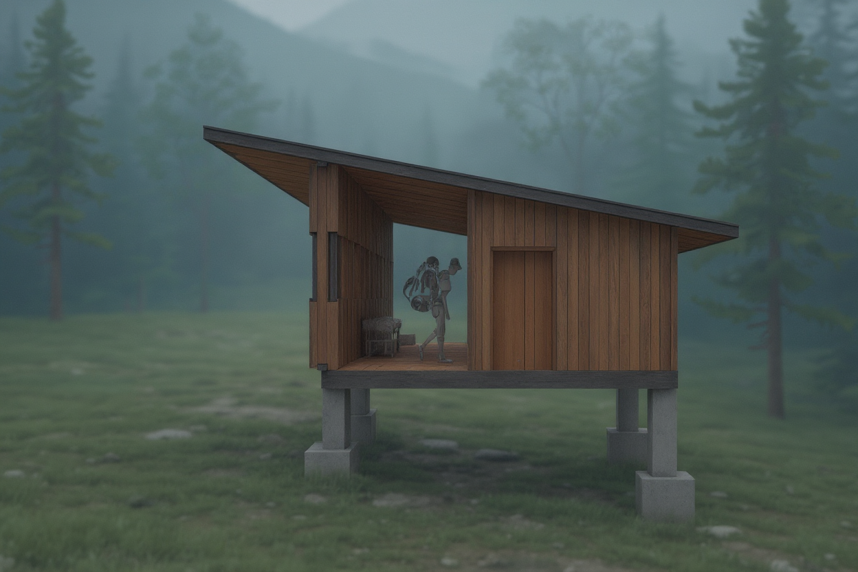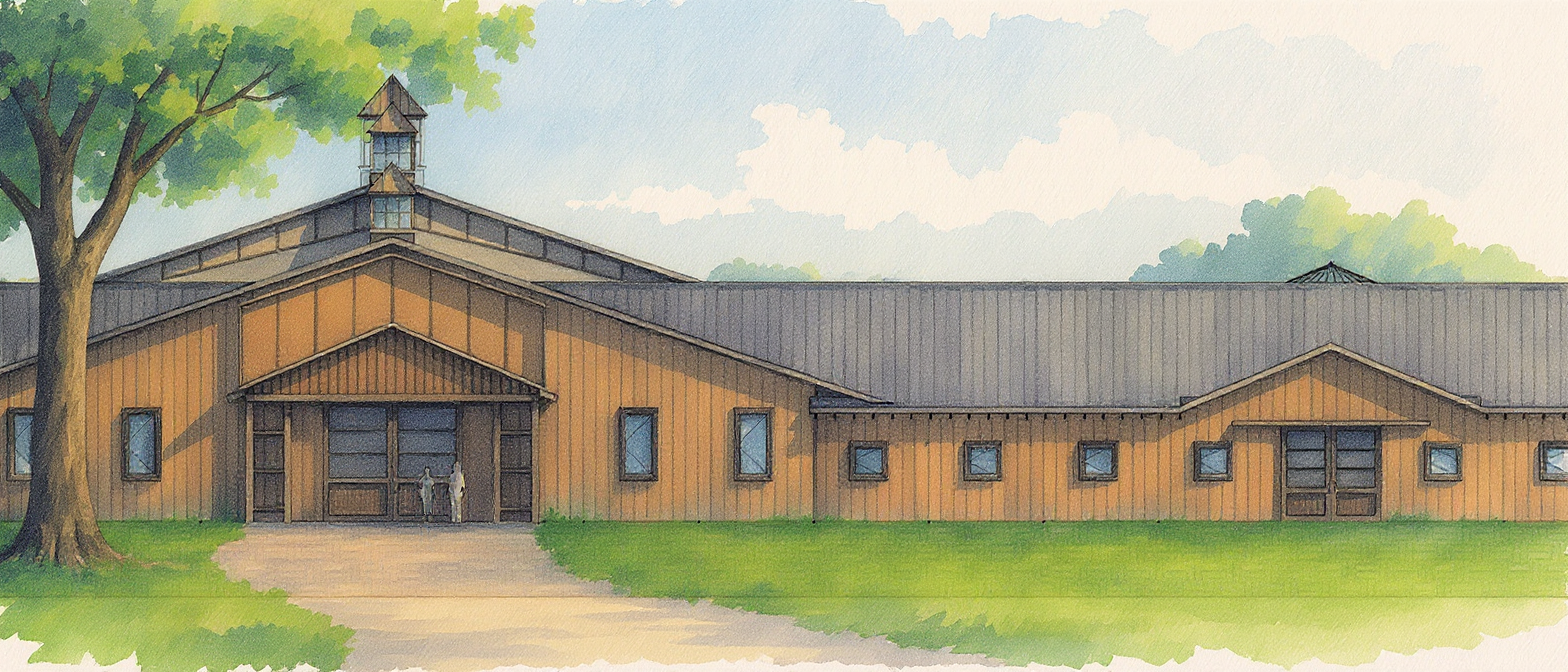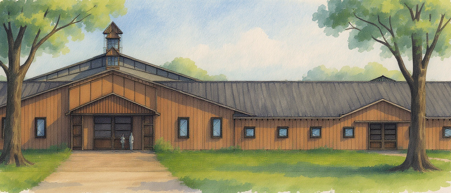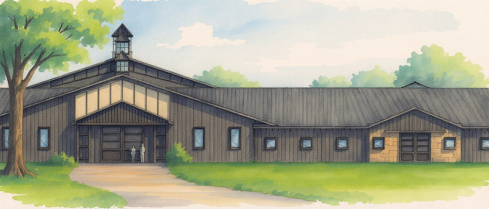 watercolor render of stable building with light brown wood siding and wainscot watercolor trees and rural environment in the background extensive watercolor landscaping surrounding the building