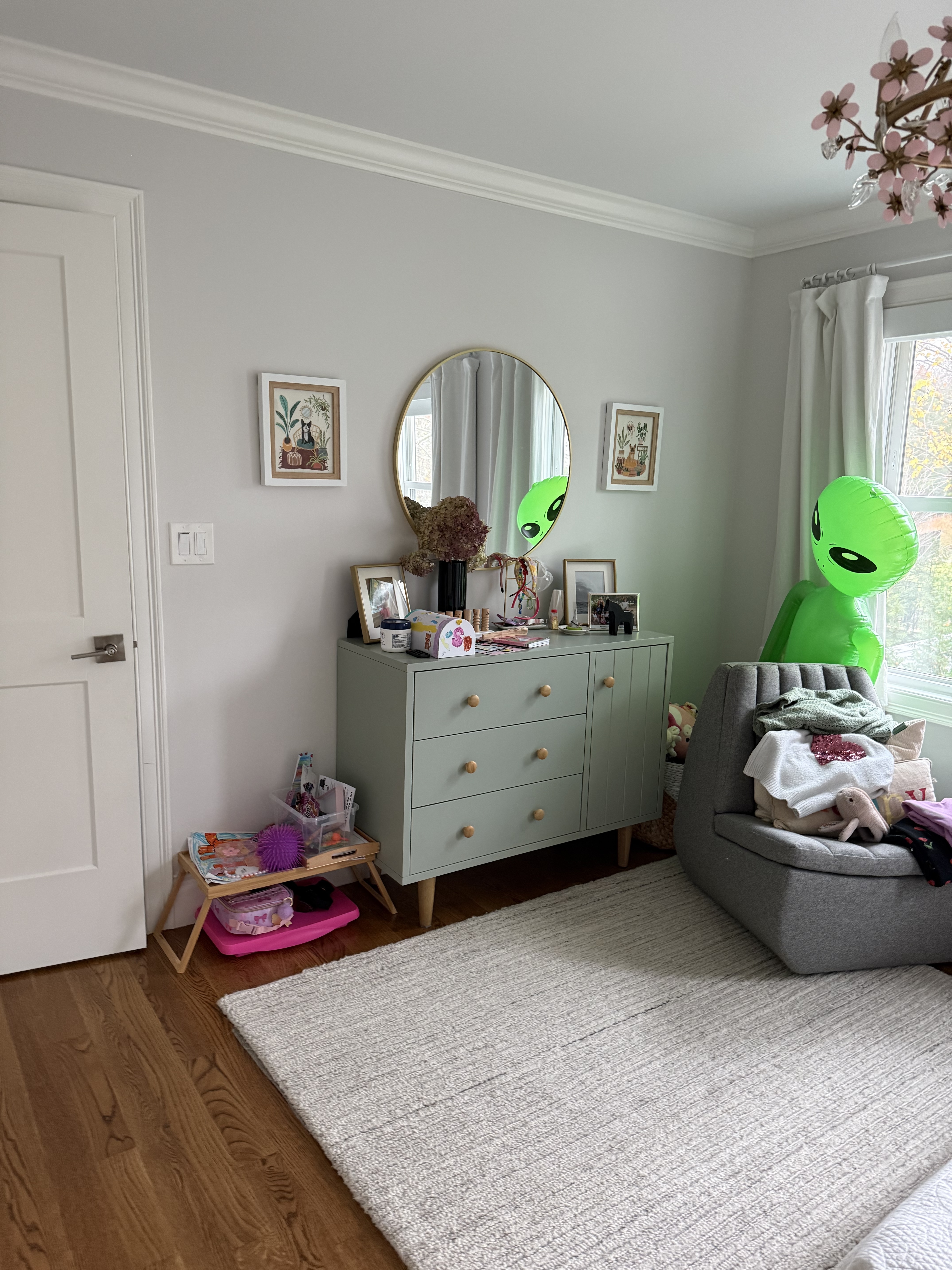 remove everything in the room except for the green dresser change the curtains to white roman blinds