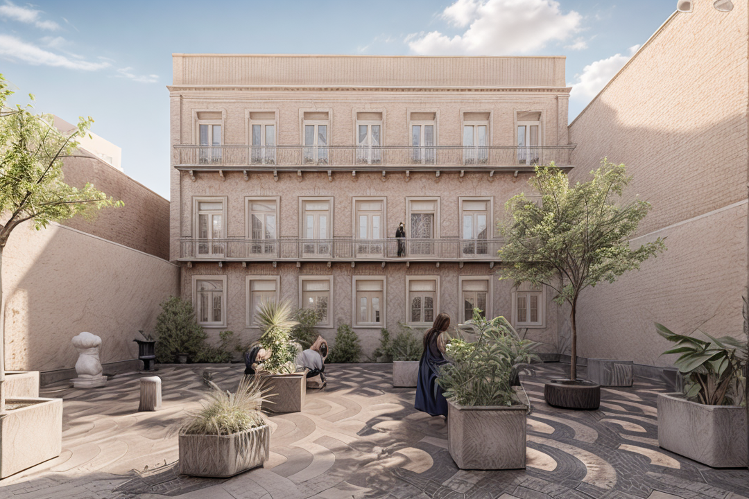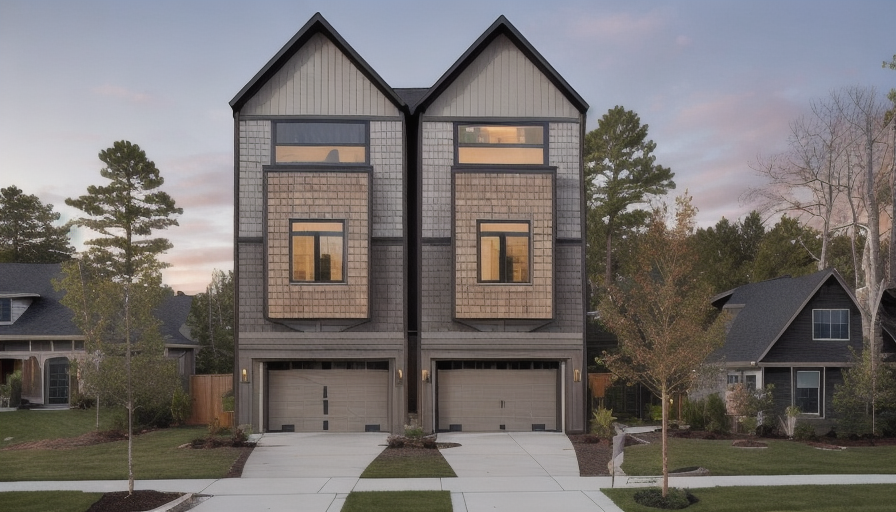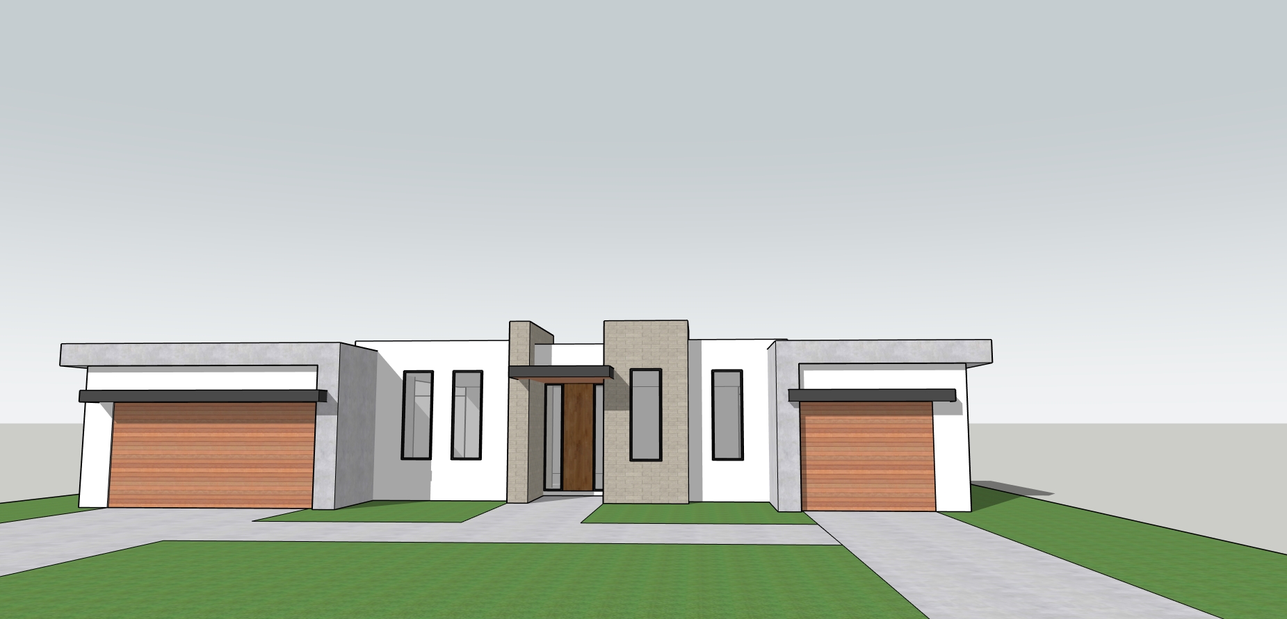 render a modern minimalist one story house with a flat roof the exterior is smooth white stucco with gray concrete accents the main entrance features a wooden door in a rich warm brown hue flanked by large vertical windows with black frames the two garage doors are made of sleek horizontal wooden panels in a light brown color the surrounding landscape is a well manicured lawn in vibrant green with a light gray concrete driveway set the atmosphere to bright daylight with a clear sky creating a fresh and contemporary vibe