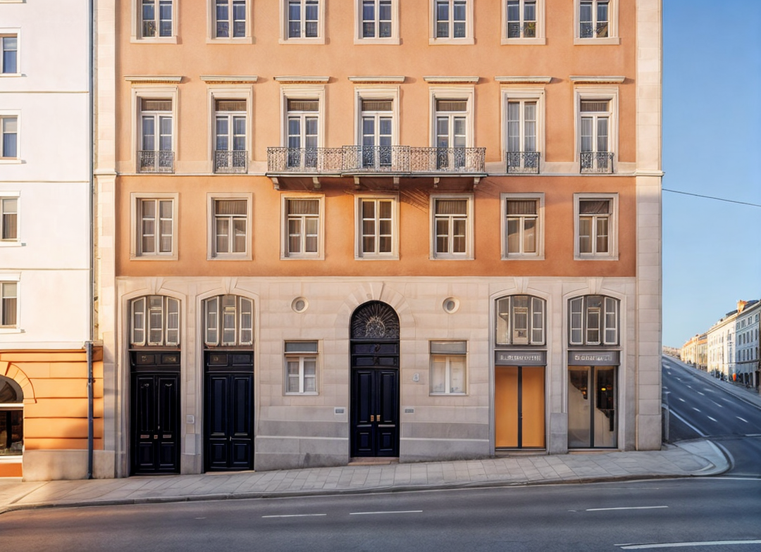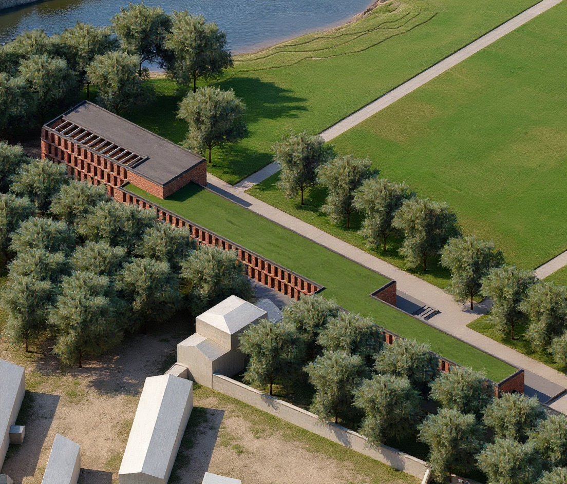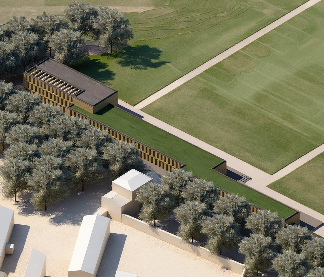 create a rendering of this image emphasizing the football field retail the structures and render the surrounding structures in realistic facade but retain the blocking massing and openings add vegetation and trees add football players playing on the field render in physically based lighting print in hd resolution architecture