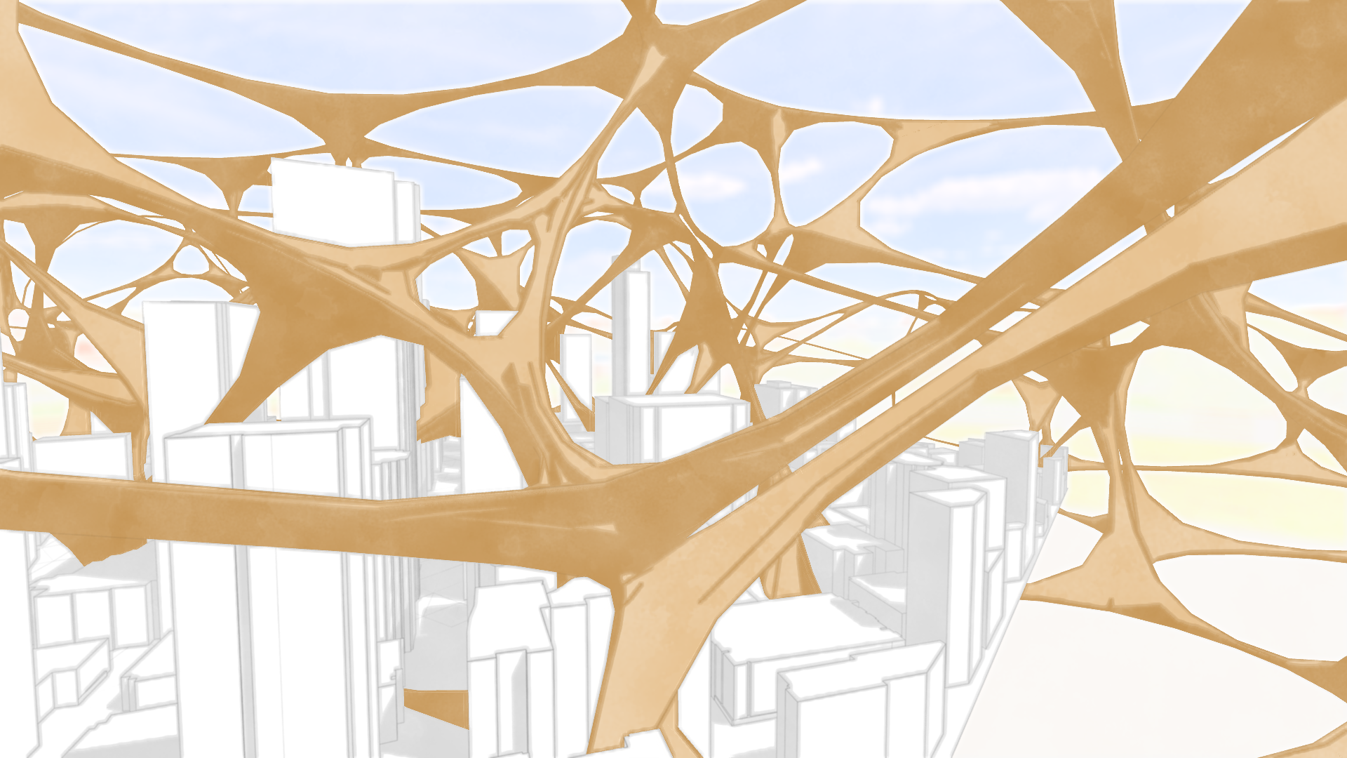 in puerto rico overly biophilic design greenery a futuristic utopian city that has this webbed occupiable bridging throughout the city elevating society in the sky with landscape below taking over as a national park intricate ornament ocupiable bridges lightrail system on structuure park and walkablable architecture