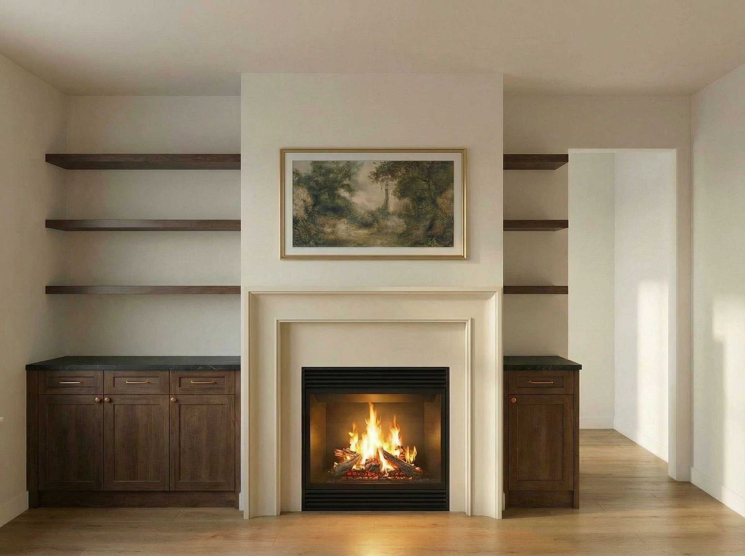 keep everything the same but replace fireplace hearth surround with the one in the reference photo but painted white