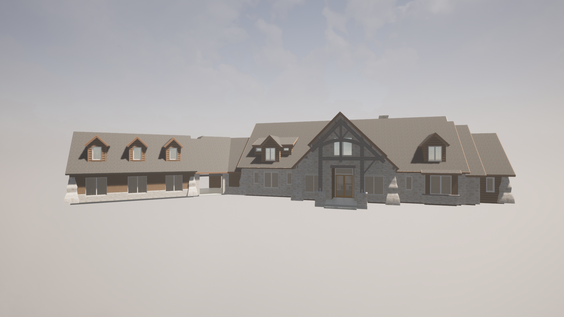 i need an improved version of this exterior using natural stone and timber construction place in a lot with trees close to a lake