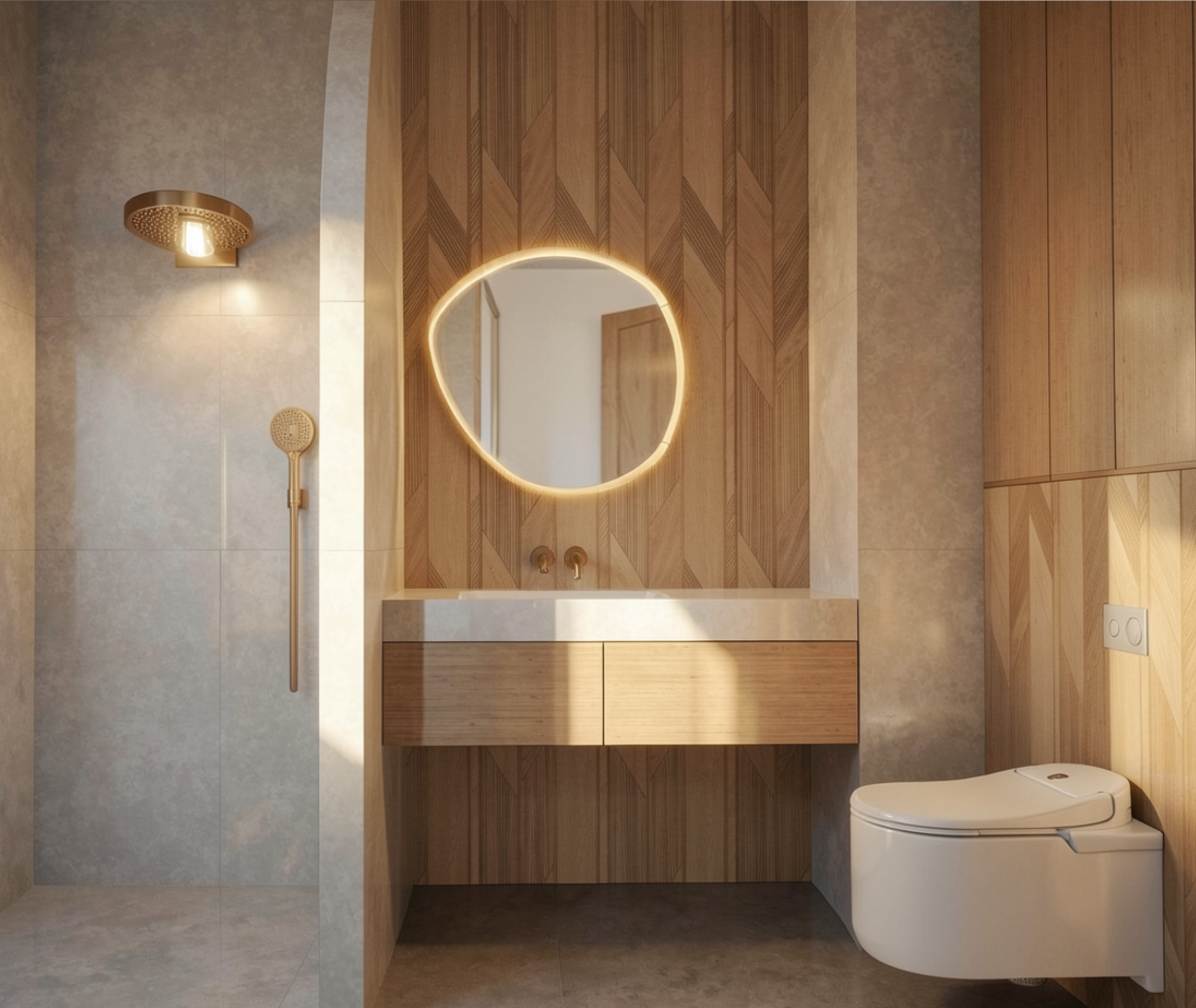 make gray walls more beige and made of microcement add elegant soap on the counter don t change anything else make room warm
