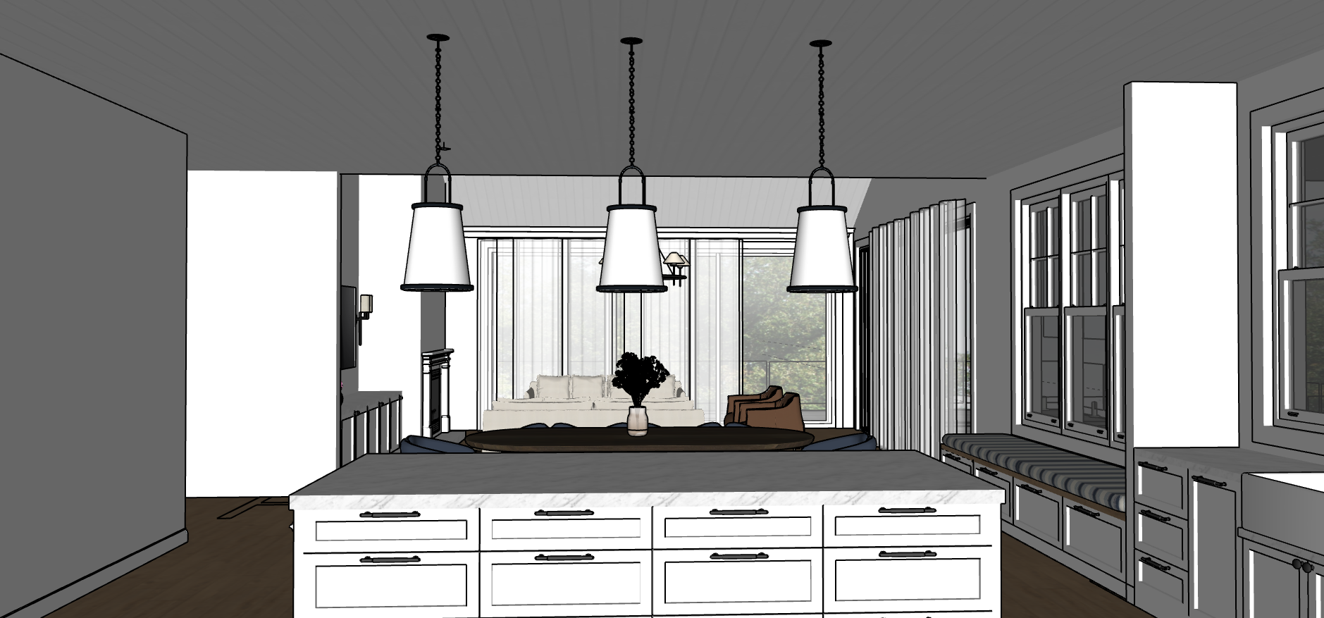 interior shot ceiling clad in vj panelling wainscoting on left wall and fireplace carrara marble on bench top walls ceiling and cabinets in white