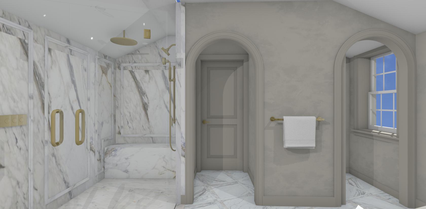 vanity cabinetry is a rift cut white oak finish with a light stain color all marble shown should be in a honed finish
