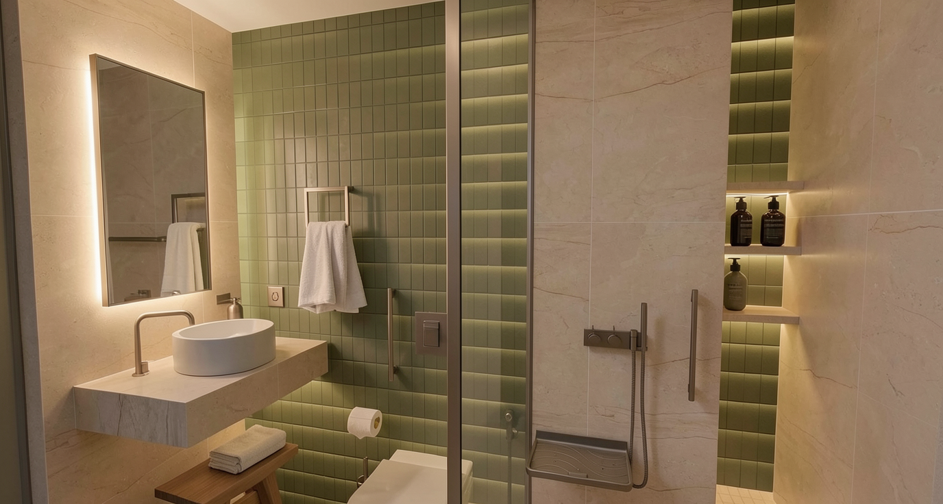 evening view and warm toned lighting make all of the walls and ceiling white cabinets are white counter top and backsplash are white marble show a kendrick lamar video on the screen on the left side of the view add a man and woman playing pool with the balls randomly spread across the pool table add a cheese and cracker platter on the countertop and some wine bottles and glasses the three objects on the ceiling near the screen are speakers