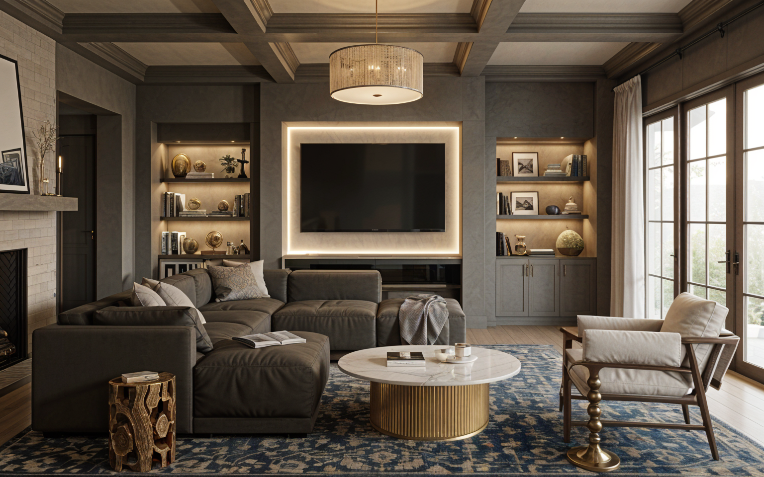 enhance this interior rendering add lighting coming from the antler chandelier hanging in the room do not add any extra furniture or details add lighting coming from the recessed ceiling cans make the lighting more even throughout with out so much shadow on the walls