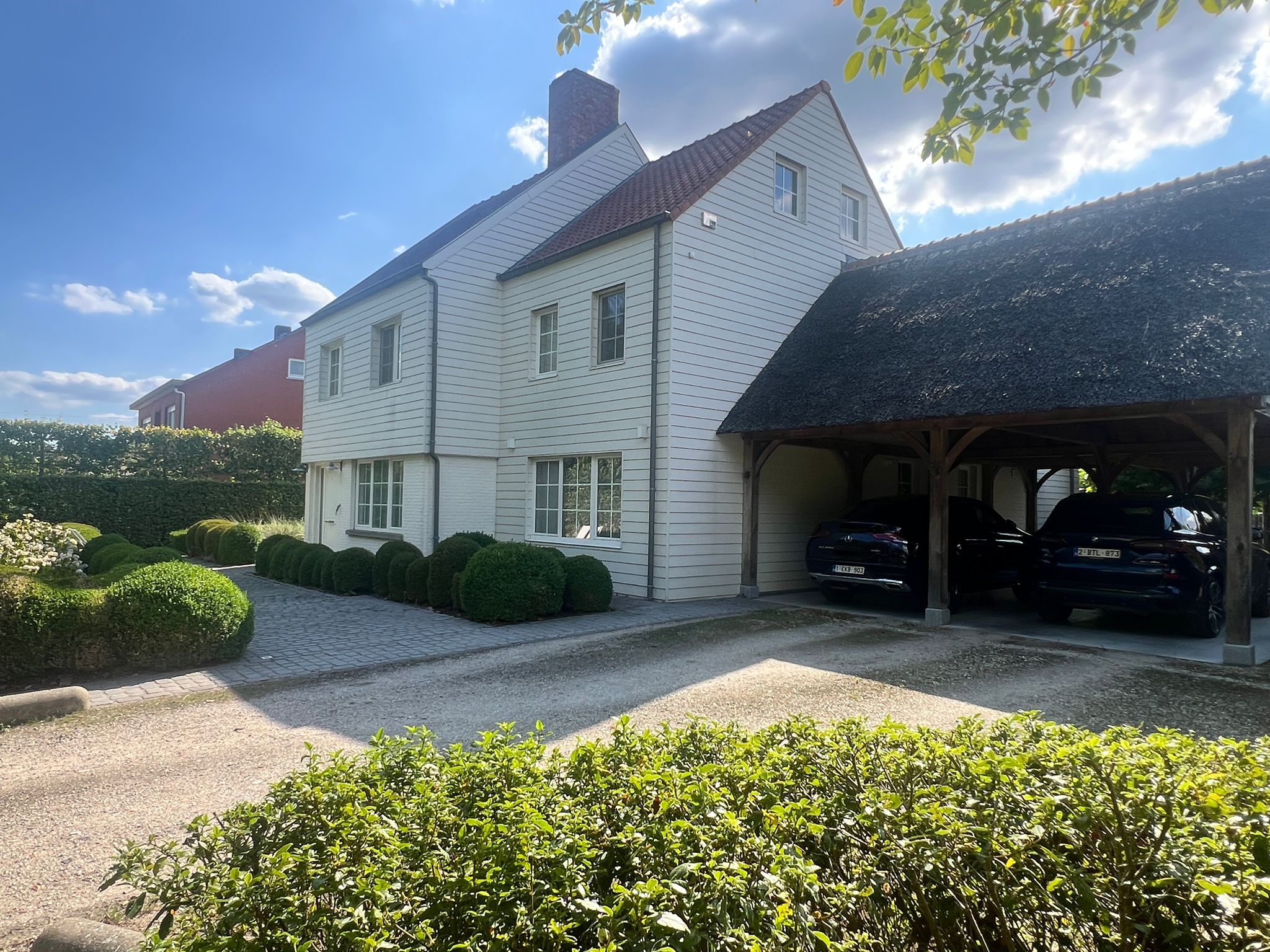 render a serene suburban scene featuring a charming white wooden house with a dark brown thatched roof include a neatly manicured garden with vibrant green bushes and hedges the driveway is composed of light gray cobblestones surrounded by a lush blossoming hedge in the foreground the sky is a bright blue dotted with fluffy white clouds casting soft shadows the atmosphere should feel peaceful and welcoming with warm afternoon sunlight gently illuminating the scene architecture