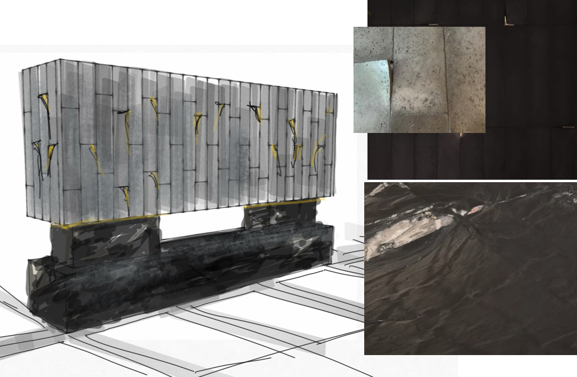 this is a fireplace with a slab base that you can sit on and then tiles on the upper portion that have sort of a pulled off corner of the tile that has a light behind it