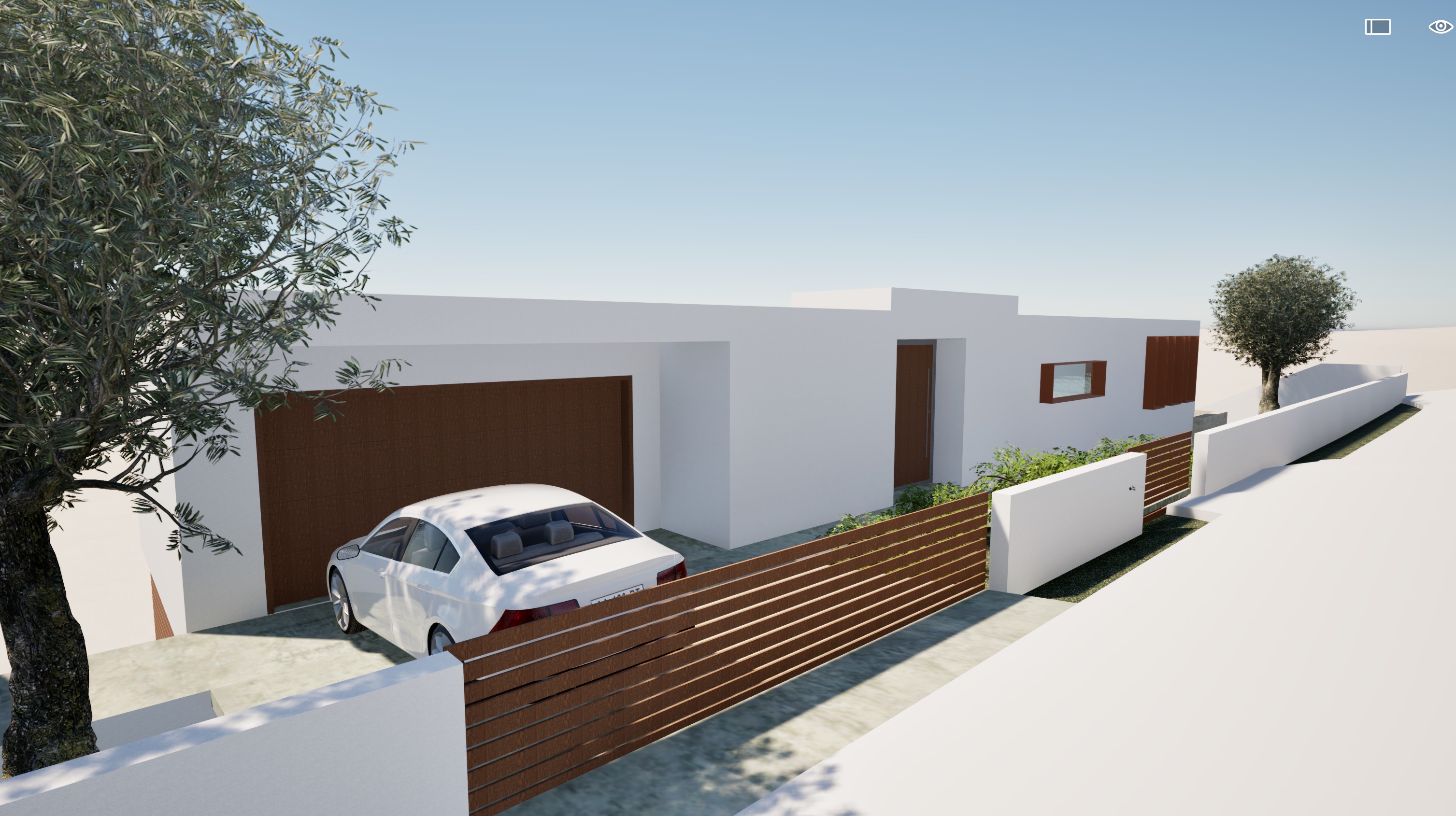 a modern house in pacific palisades ca overlooking the pacific ocean with smooth white plaster finish corten steel window trims view from the street with mature olive trees and california native bushes and houses surrounding the building california sunny clear blue skies
