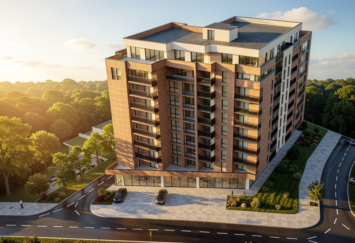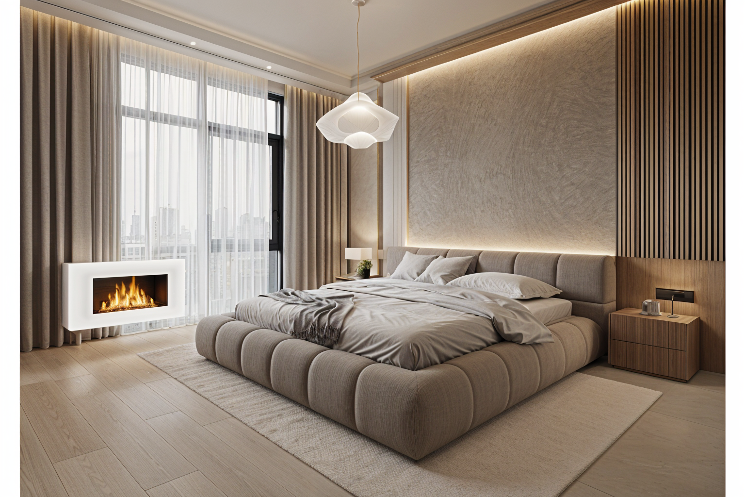 e una sala per cene a terra abbiamo un pavimento in parquet in rovere chiaro continuo a liscio sulla parete di sinistra c sopra alla cucina un tubo in acciaio zincato la cucina ha una strip led sotto i pensili e il fondo in piastrelle verde opaco in rilievo leggermente bombate nella parete di fondo dipinto un arco verde le altre pareti sono bianche al centro abbiamo una tavola con il piano in marmo calacatta e gambe in ferro nero sopra alla tavola ci sono delle lampade a sospensione in ceramica opaca verde e sono accese le sedie sono in legno di colore verde sulla parete di destra ci sono sgabelli in legno e un pianale bianco con sotto una strip led metti qualche piatto sparso sulla tavola per simulare una cena gi iniziata e qualche attrezzo sulla cucina in esterno simula una luce di tarda serata con sfondo di alberi che si intravede dalla tenda