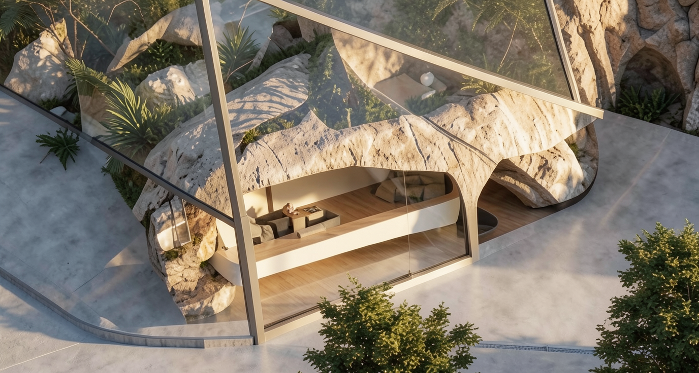 zaha hadid exterior shot realistic 3d floor plan layout of the main floor of a single family home 988 sq ft living space the layout includes the following rooms and spaces great room 12 0 x 14 4 open to above located centrally with staircase adjacent dining room 14 0 x 9 6 open to the kitchen with an engineered flush beam above kitchen 11 4 x 11 4 includes island refrigerator and pantry alcove adjacent to dining pantry off the kitchen on the east side den flex room 10 10 x 9 0 located near the front entry can serve as office or bedroom mudroom near the rear garage entry with closet and bench area 2 piece bathroom near the mudroom den area coat closet near main entry covered deck approx 12 0 x 10 0 accessible from the dining area via sliding door triple attached garage 34 0 wide non rectangular footprint with the left two stall side being 23 0 deep and the right single stall side being 26 6 deep creating a stepped rear wall two overhead doors one 18 x9 double wide door on the left covering two stalls and one 8 x9 single door on the right for the third stall finished interior with insulated walls and ceiling 12 7mm gypsum board with vapour barrier engineered raised beam across the garage opening general notes open concept main living area 9 foot ceilings throughout wood look flooring in main living areas central staircase leading to upper floor garage entry connects to mudroom architecture
