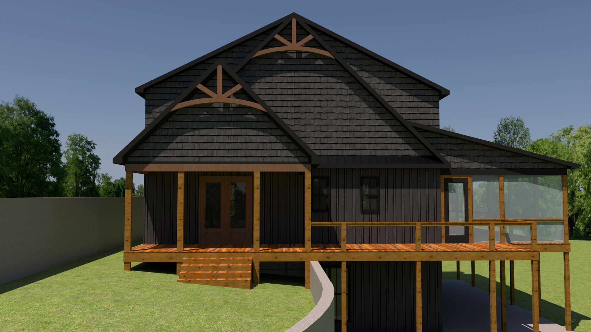 add landscaping wooded lot make realistic iron ore color siding black trim and windows add gravel parking area between retaining wall and left side of house add sidewalk from parking area and steps to porch