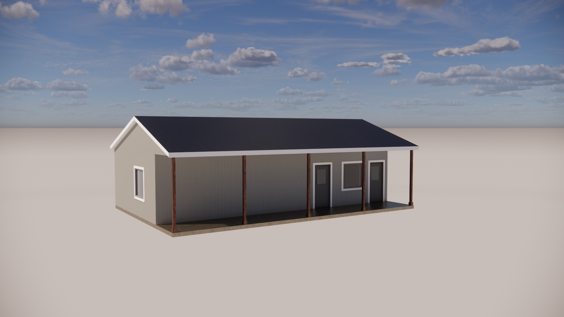 you are a professional rendering service and offer the highest quality renderings in the us this is a restroom laundry building at an rv park do not change any walls do not change any doors there are two doors on the front keep them in the exact location as the prompt drawing do not change any windows it is a metal cladding exterior with a metal roof add landscaping a parking lot in front of the building and some relaxing chairs on the front porch