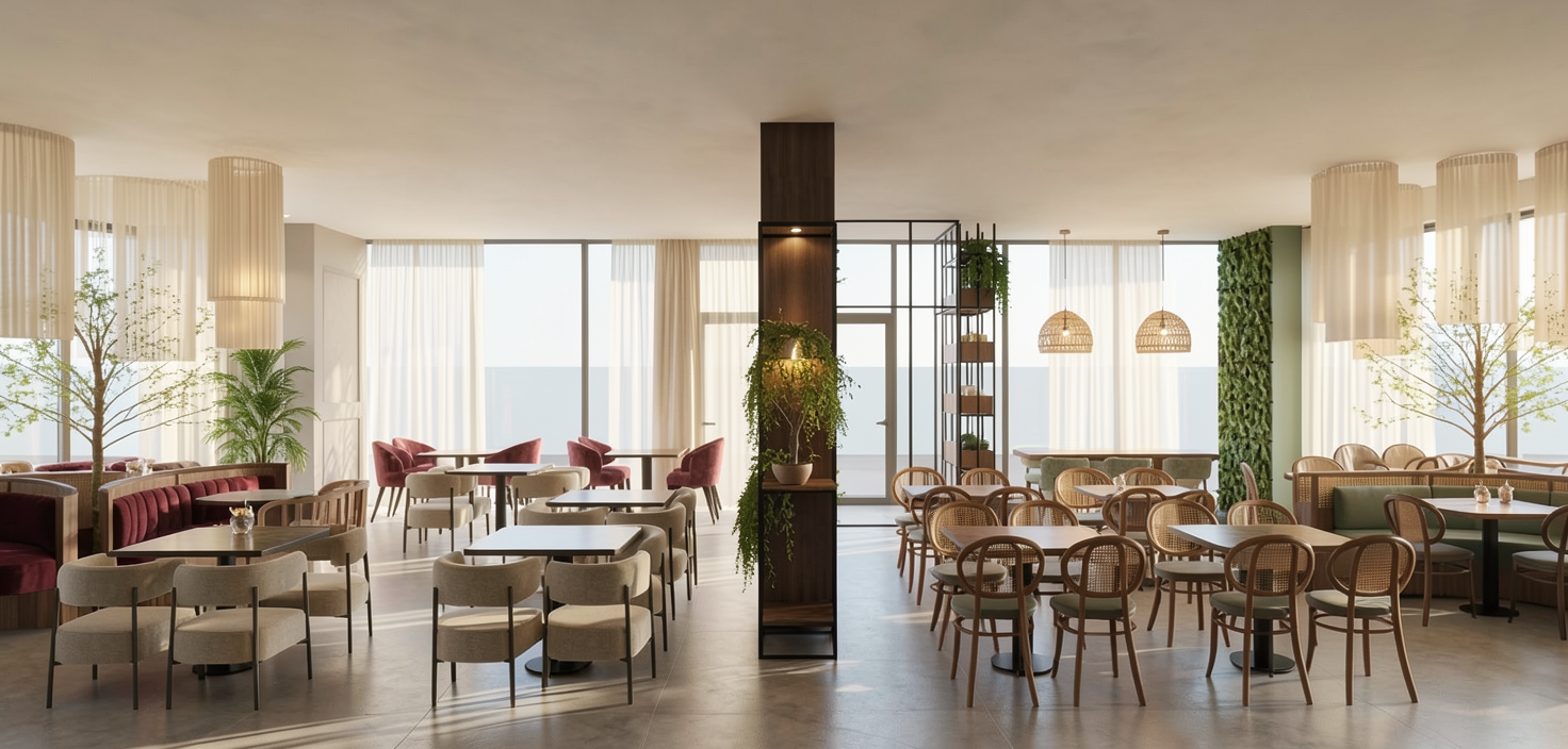 photo d architecture d int rieur ultra r aliste d un salon de coiffure de luxe au design chaleureux et contemporain au centre une immense table de coiffage ronde en bois de ch ne massif sans miroir un luminaire monumental au dessus de la table une structure tubulaire fluide et organique aux courbes futuristes mettant une lumi re douce autour de la table 6 fauteuils l gants en tissu beige textur l arri re plan un bar coloration con u comme une cuisine ouverte haut de gamme avec un comptoir en bois brut et des tabourets de bar align s sur le c t gauche un espace barbier luxueux avec deux fauteuils en cuir vintage devant de grands miroirs ronds r tro clair s des voilages transparents filtrent la lumi re naturelle devant de grandes fen tres sol en b ton cir atmosph re de spa haut de gamme rendu 8k clairage cin matographique pas de verriere du tout au fond mettre des fauteuil avec des lampadaires et une table basses avec deux portes d acces