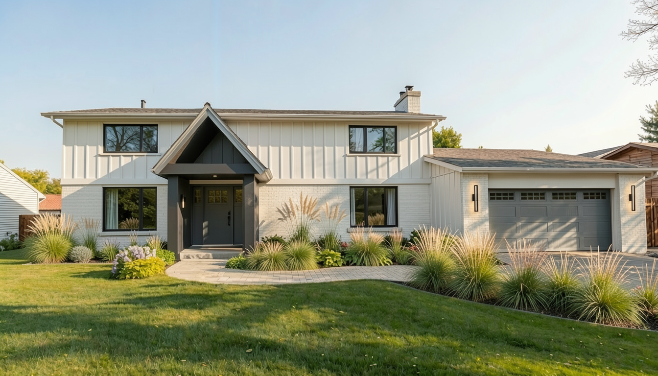 keep the structure the same with only the following changes remove the wooden shutters and window boxes remove the red tree change the entry structure to be more modern in style and shape have it extend 4 feet to the right case the windows in black change the landscaping to be more modern plants like ornamental grasses modify the entry porch canopy so it is smaller and lighter remove the side walls and keep only two square support posts the canopy should be open on both sides and extend only slightly beyond the posts reduce the depth of the roof so it looks modern and minimal with clean horizontal lines be sure the sides of the entryway is open and closed off with walls remove windows from the garage door
