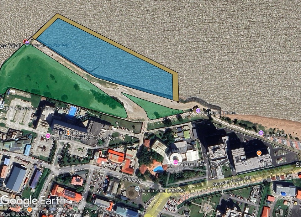 a large mega pool surrounded by a boardwalk with a landscaped park and picnic area to the south