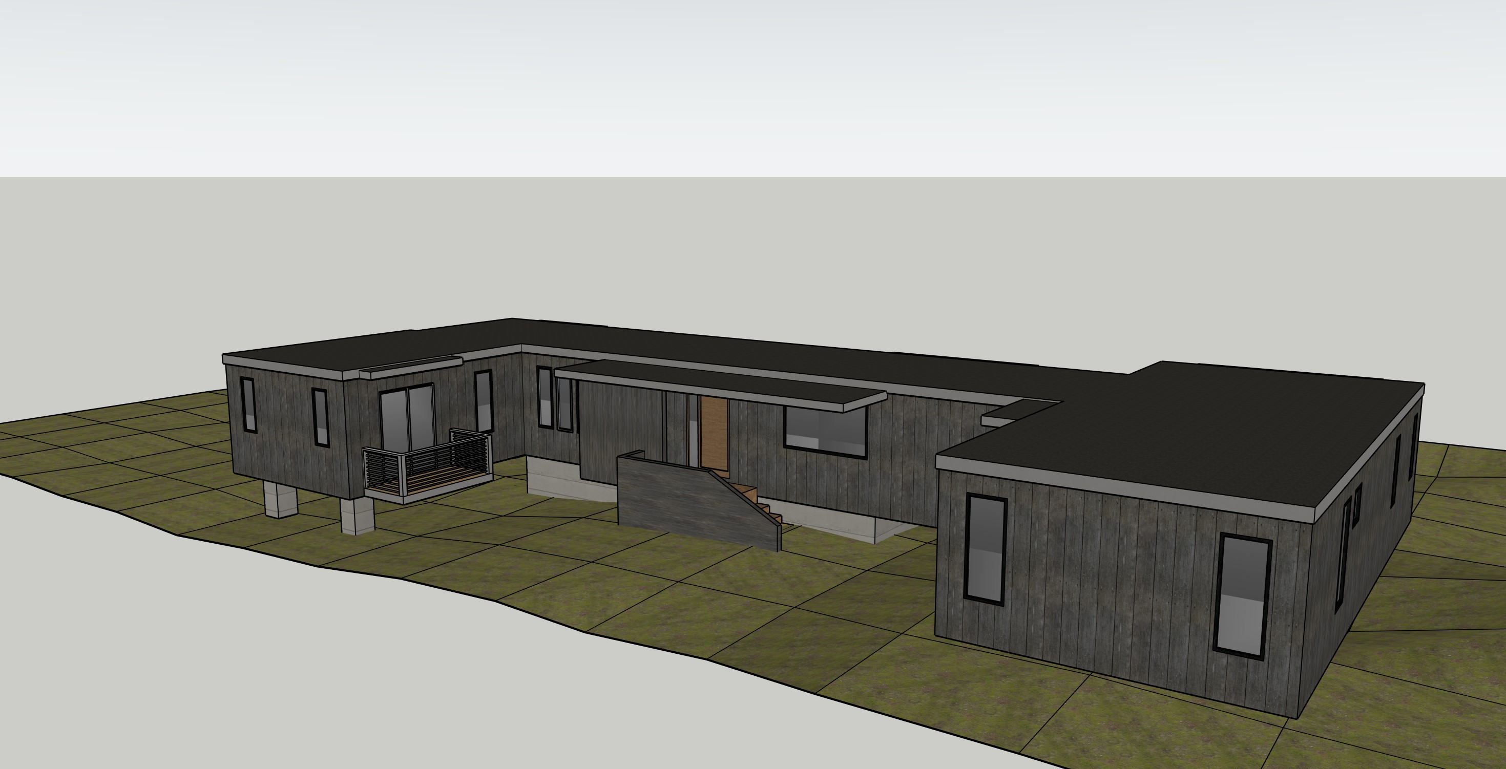 modernist exterior shot contemporary home with black vertical wood siding black window frames dark gray metal fascia trim home is set in an open grass area surrounded by trees architecture