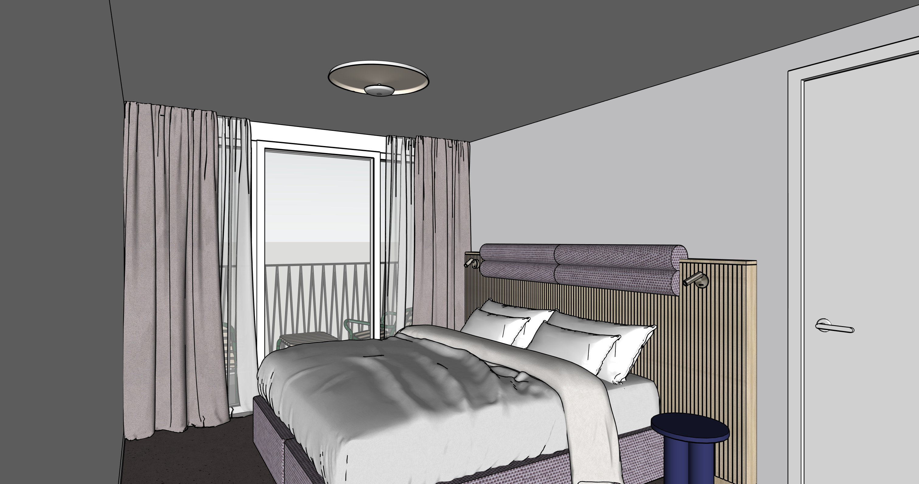 bedroom with white sheets headboard in a natural oak wood upholstery in a slightly purple and grey fabric with structure royal blue side tables chrome reading lamps chrome handle on door floor is a polished subfloor