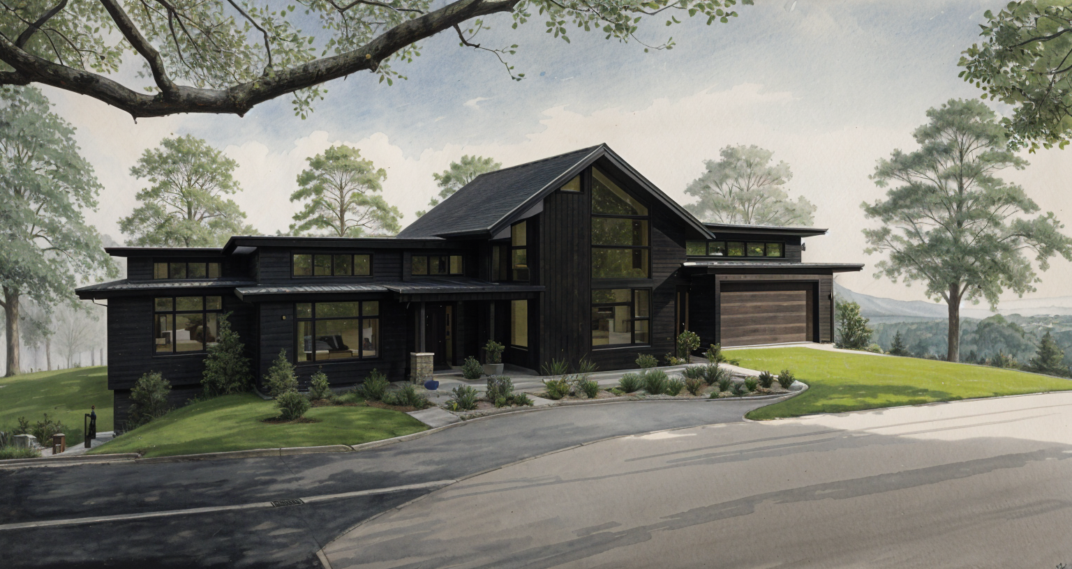 exterior shot traditional snowy pine forest uphill dark wood exterior stone base architecture