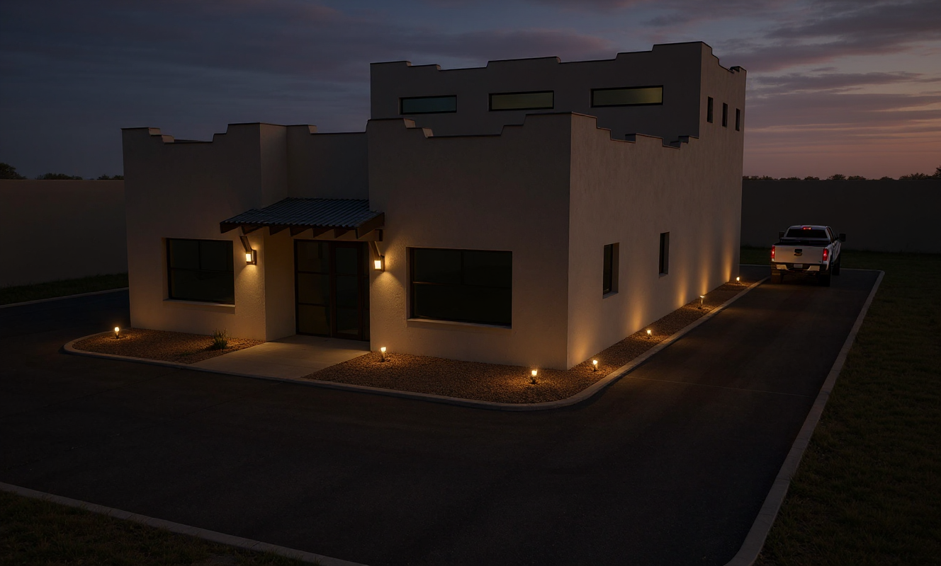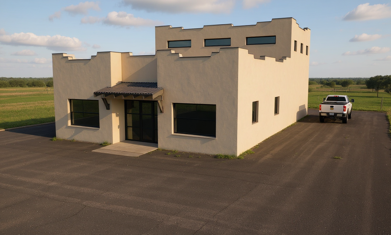 trim color at top of wall to match the stucco color door and window frames are black add some clouds to match a typical summer kansas afternoon change to a june late in the afternoon add asphalt paving around the building add wallpack down lights on the perimeter walls