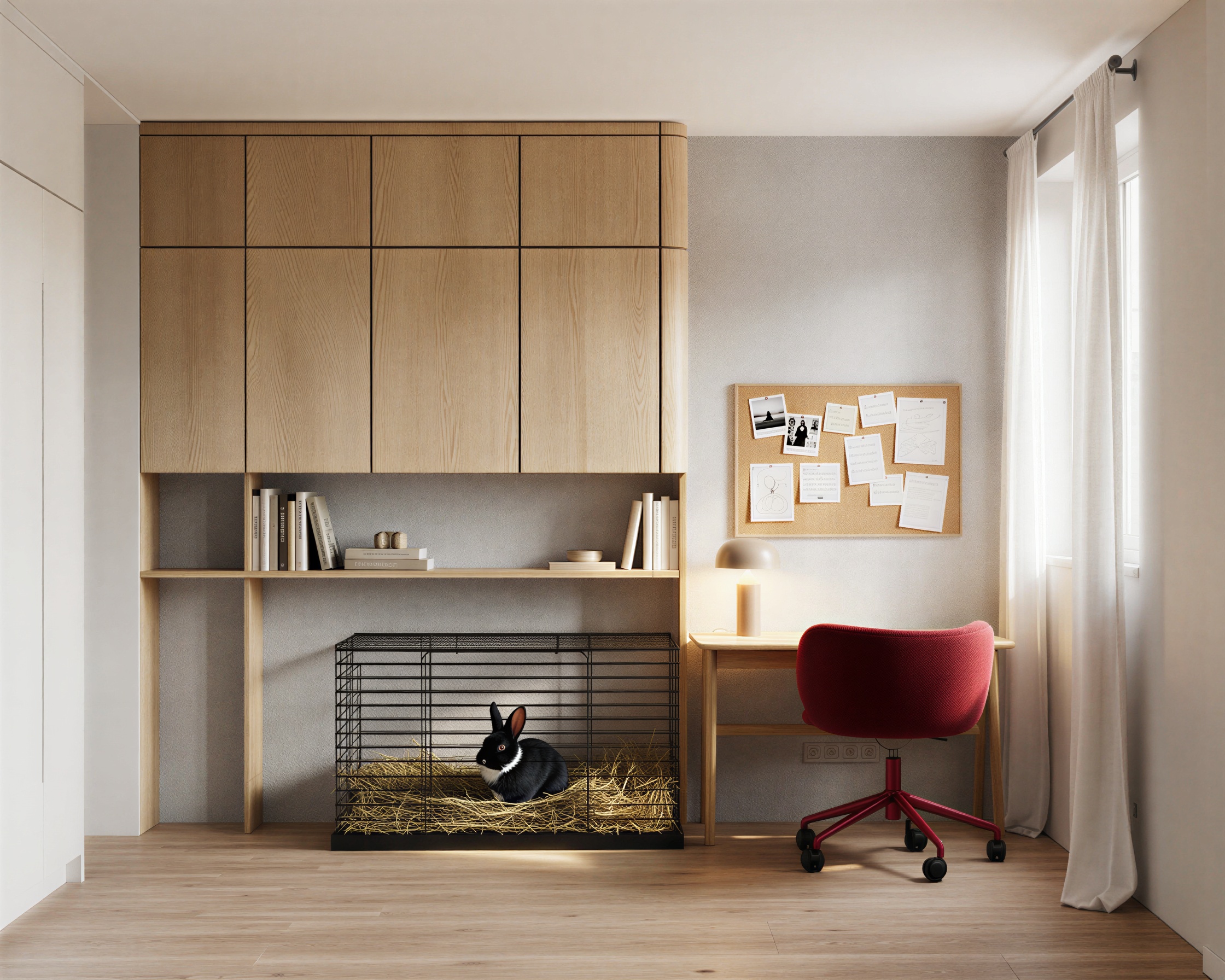 use the provided image strictly as the base image do not change the camera angle composition lighting furniture materials textures or any objects in the scene the room desk chair cabinet cage hay and all elements must remain exactly the same modify only the rabbit change the rabbit so that it has floppy lop ears that hang down along the sides of its head like a lop rabbit the ears must naturally droop downward instead of standing upright keep the rabbit in the exact same position inside the cage with the same body size pose fur color black with white markings and lighting do not move the rabbit do not change the cage and do not alter any other part of the image only adjust the rabbit s ears so they hang down