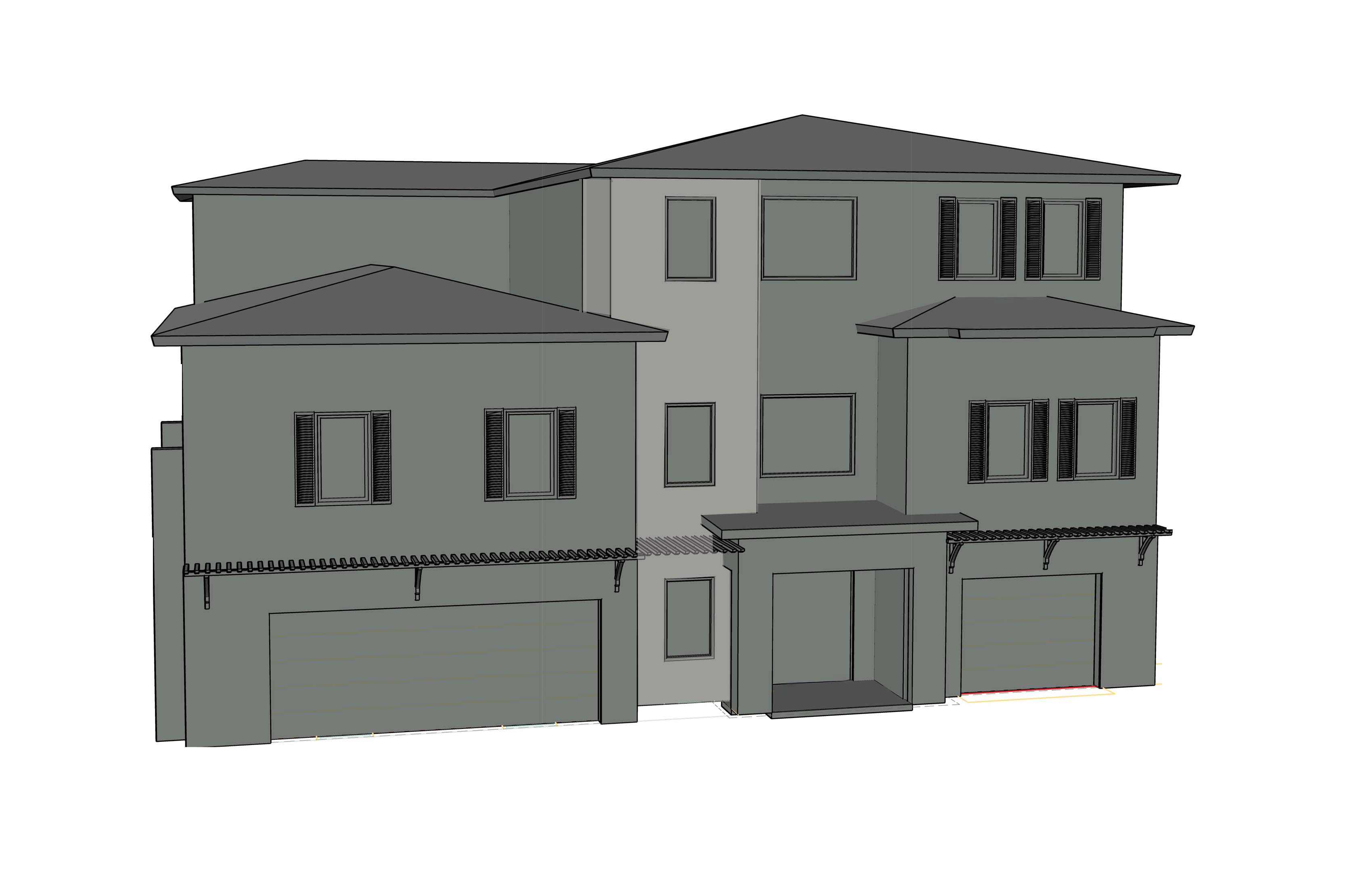 render a hyper realistic modern high end contemporary three story house in florida setting where there are palm trees and the lights are lit up on the outside of the house the window frames are dark gray maintain the window design where there are shutter design on left and right side the garage door is a sleek modern design in matte gray with wide horizontal panels and narrow glass inserts that create a clean contemporary look while letting in controlled natural light the roof is gray metal roof featuring a mix of gray brick white stone featuring large windows the exterior features a horizontal walnut wood panels on the left center where the 3 windows are located and it wraps around on the left atleast 1 foot the finishing around the garage doors are light gray bricks the entrance includes a square arched in dark gray bricks the main door is 6 feet wide made of frosted glass with 4 horizontal mulls the trellis are all in walnut brown the walls are a soft light gray with a smooth finish creating a serene and inviting atmosphere with lots of greeneries and landscape and with dramatic sky