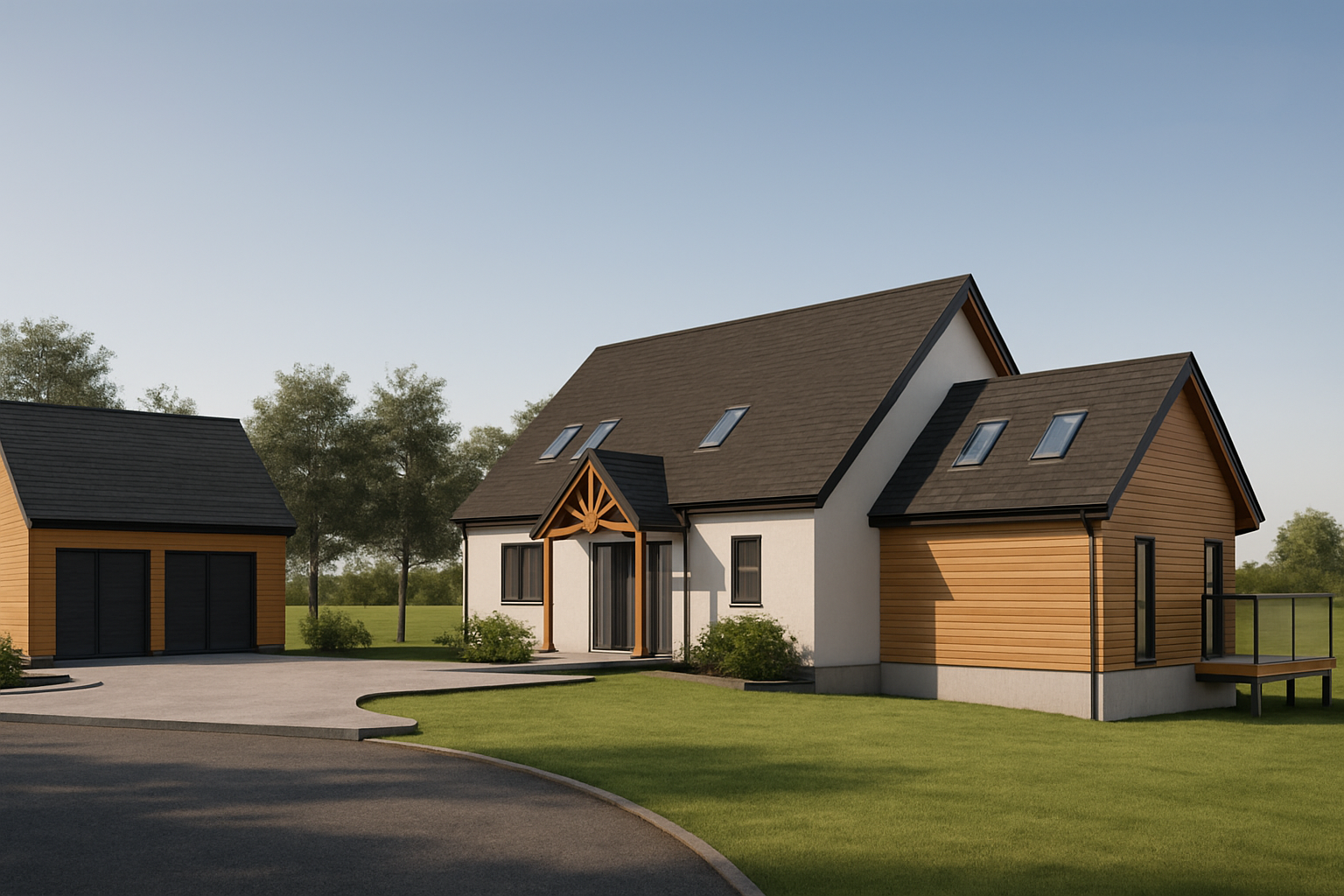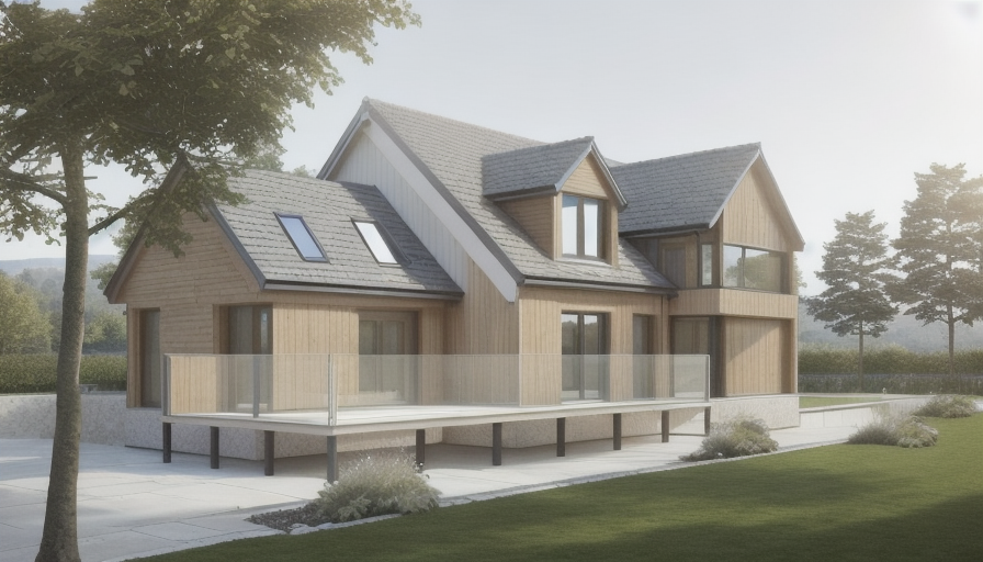 a manicured lawn low maintenance shrubs native scottish pine trees in background with plants stone pathway leading to the entrance