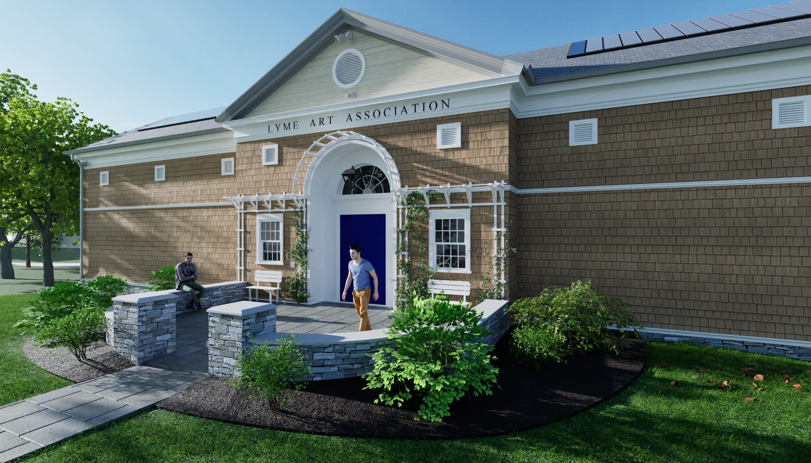 this is the front entrance for a local art gallery the siding is a natural wood shingle and the roof is a dark slate shingle there is a low stone wall surrounding the entrance making a patio this patio is surrounded by dense plantings at the entrance rose bushes are climbing a wood trellis the door is painted blue the sky is sunny with puffy white clouds the end gable is clad in horizontal white wood