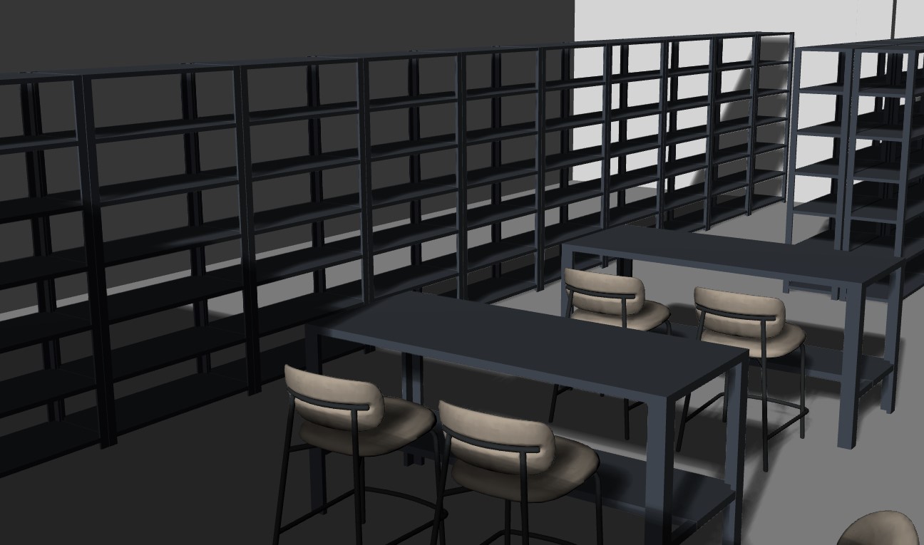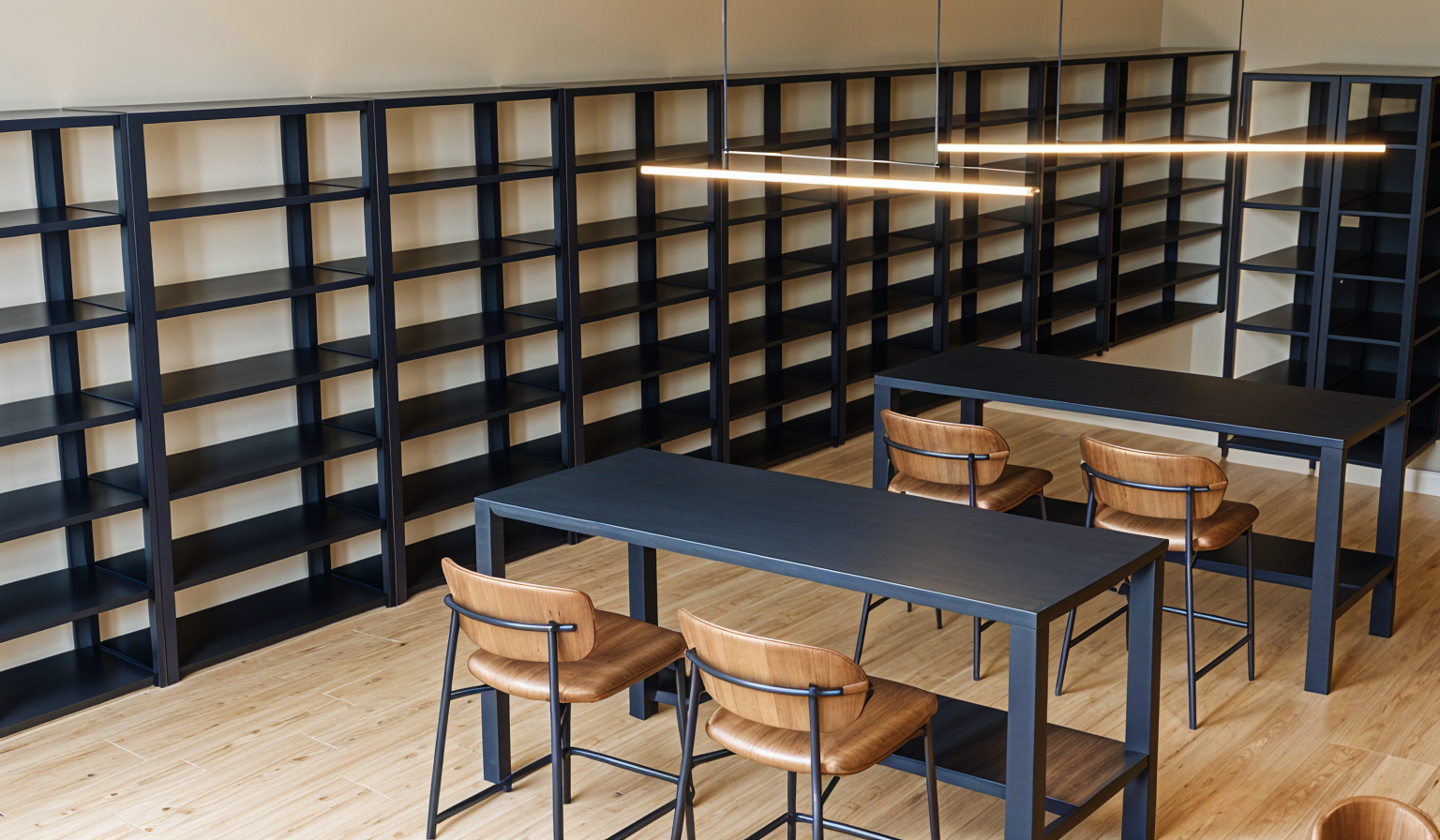flooring is light oak stools are leather walls are a light beige tables are dark navy blue shelves are dark navy blue there is a linear pendant light hung above each table there is a moody area rug under the tables