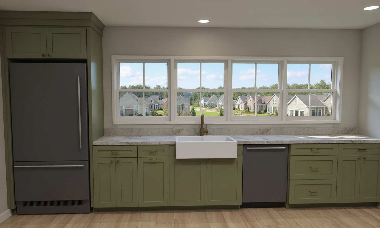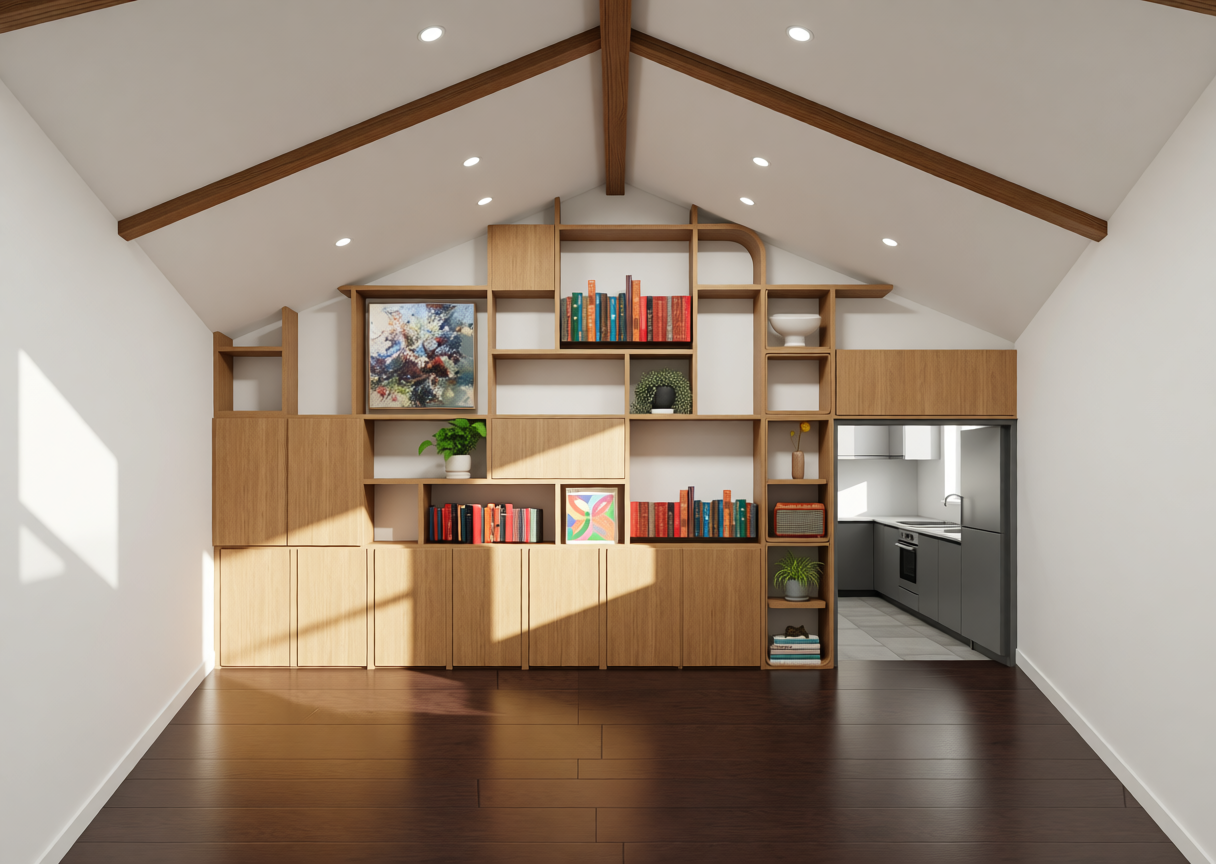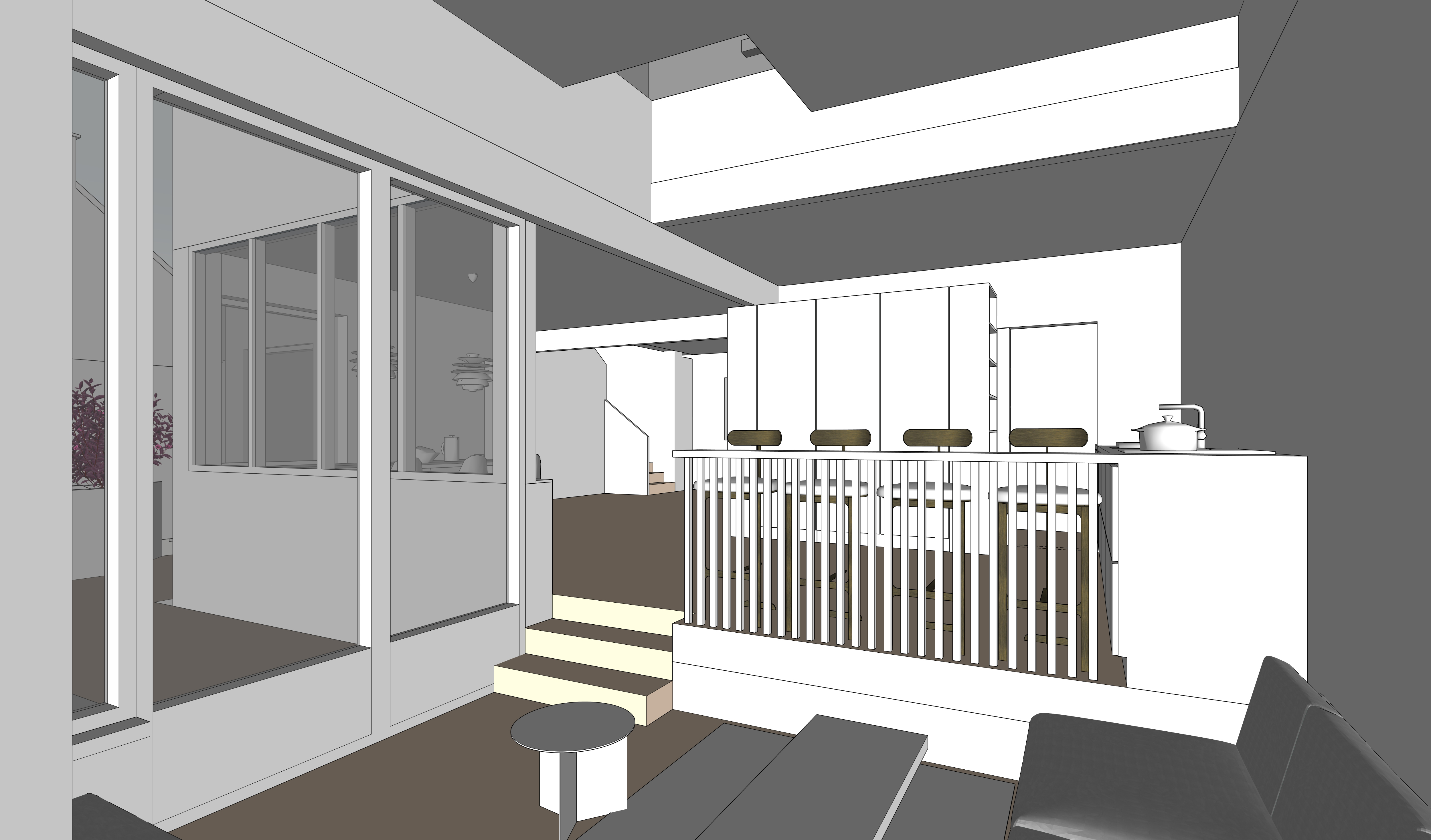 create a soft light interior view showing this layer space materials should be kept neutral with a light grey polished concrete floor and warm oak timber windows with a modern oak kitchen in the background include internal planting to give lift to the space