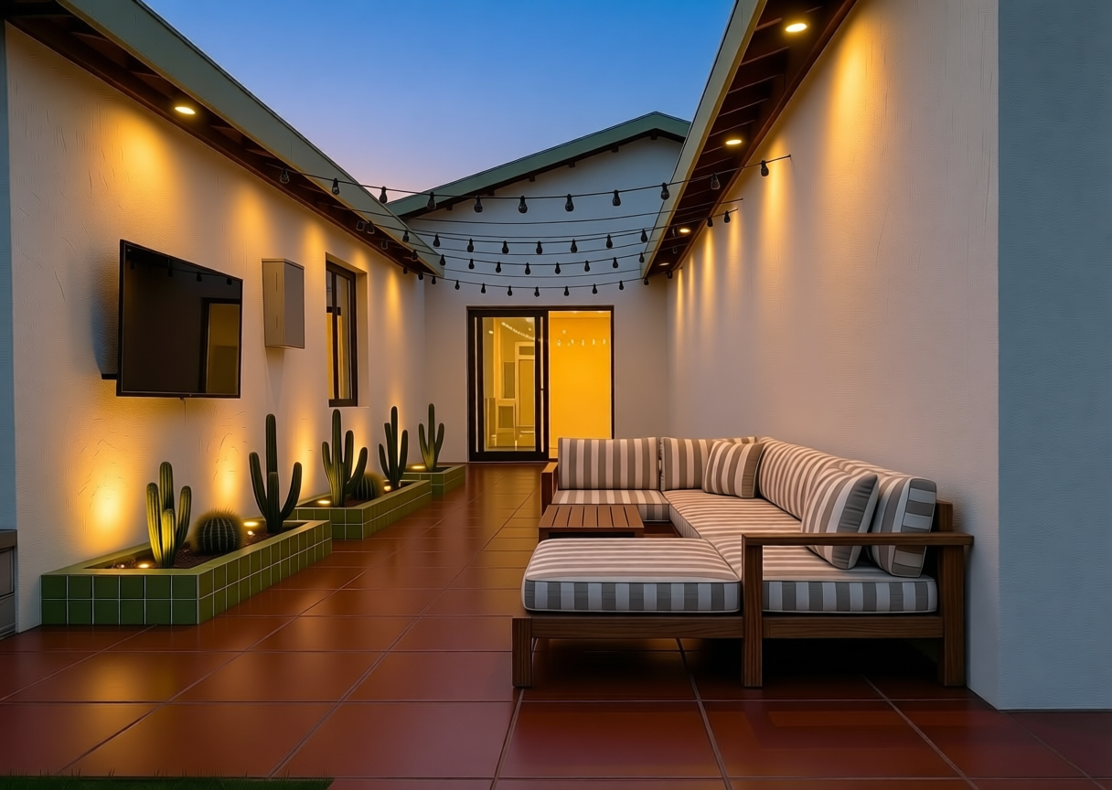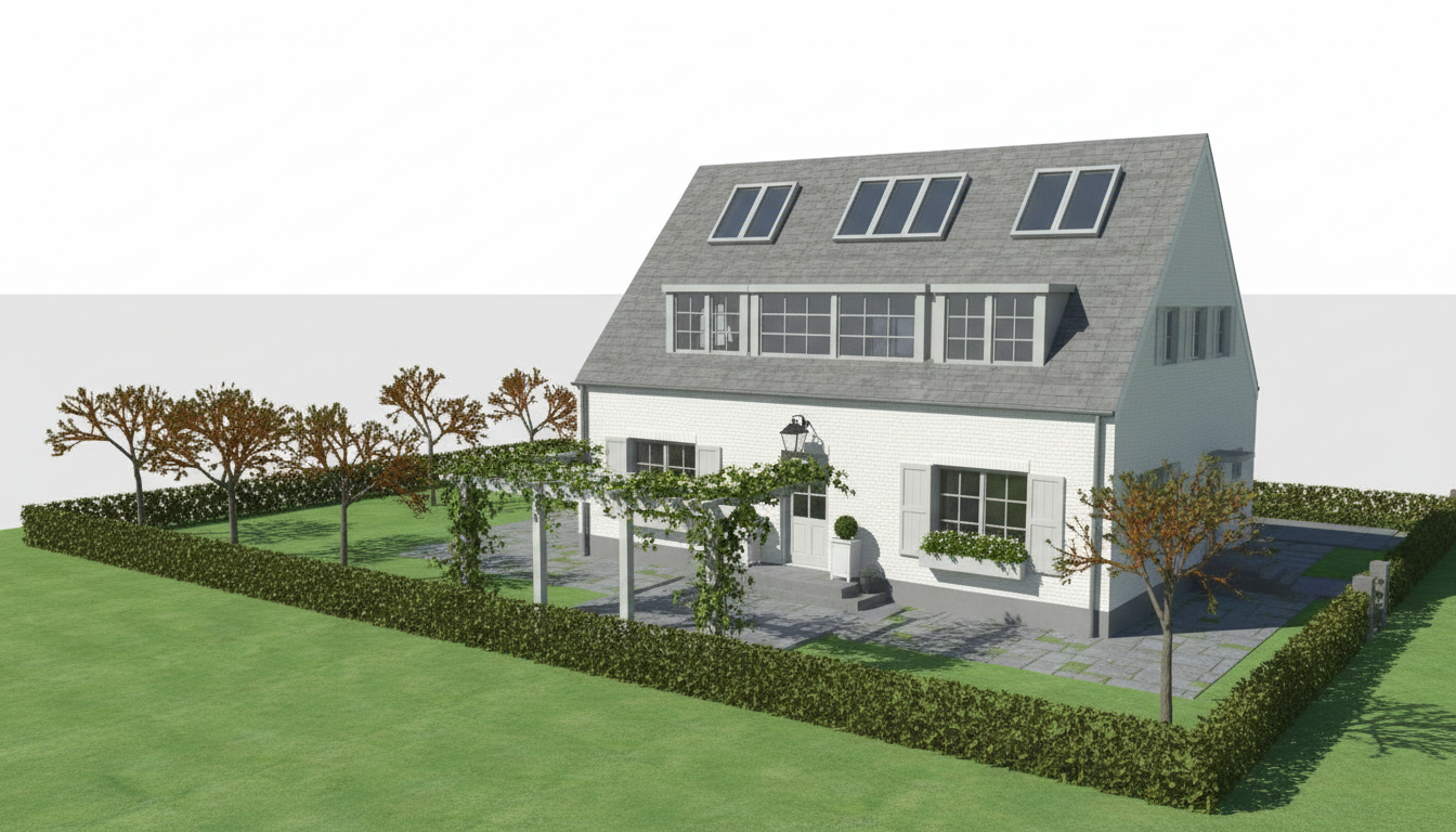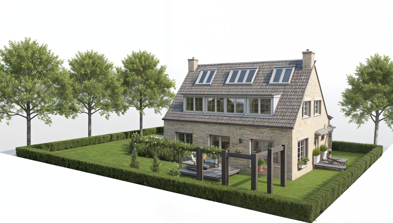 create a soft light interior view showing this layer space materials should be kept neutral with a light grey polished concrete floor and warm oak timber windows with a modern oak kitchen in the background include internal planting to give lift to the space