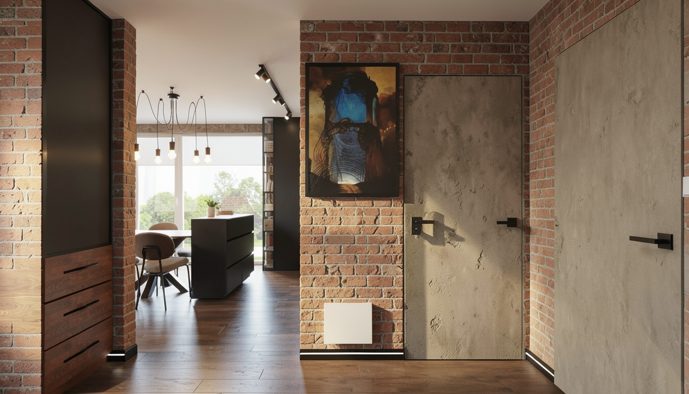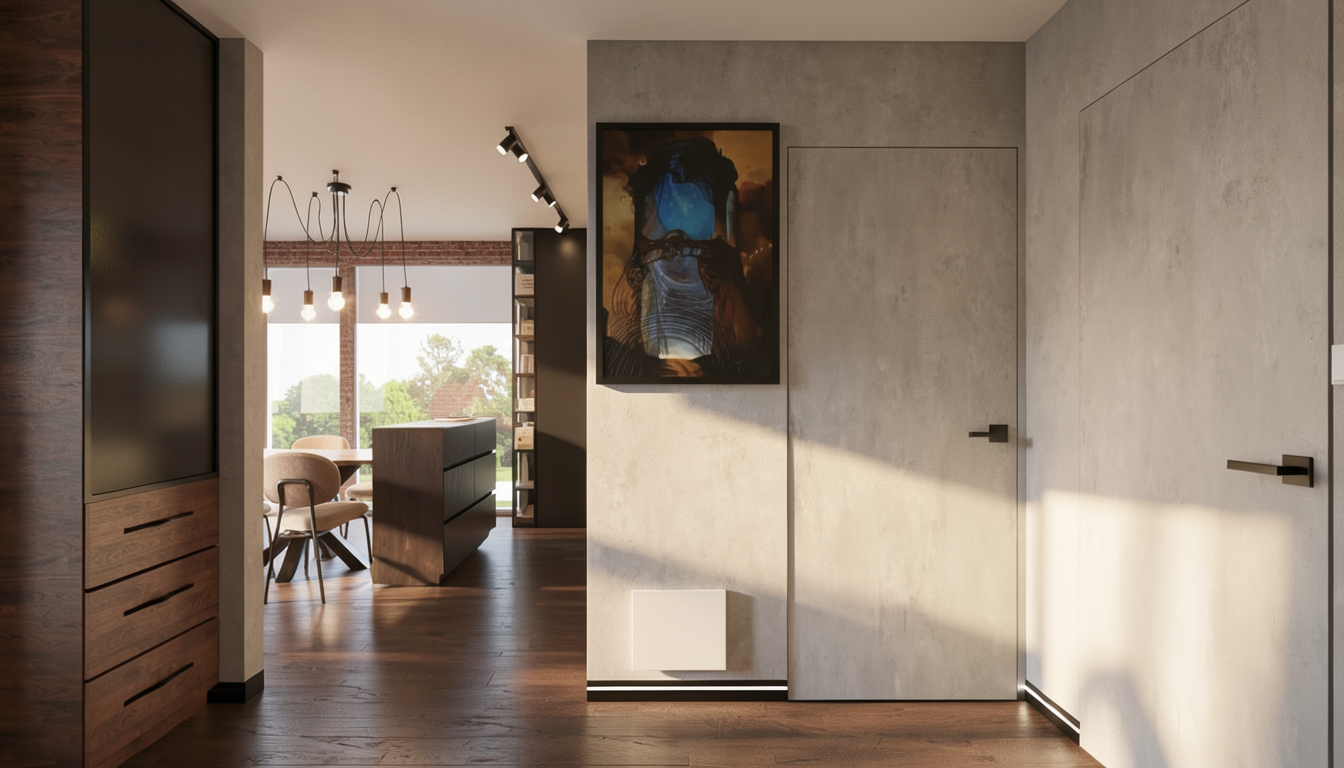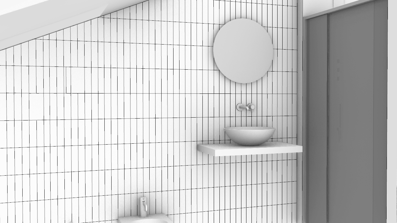 render a modern bathroom with a sleek design use textured effect tiles alternating glossy and matt beige sage green sink shelf brass sink and bidet tap transparent shower cubicle with brass shower column to create a clean and bright atmosphere the ceiling should be a crisp white to reflect light gently above it place a simple round mirror use a subtle chrome finish for the faucet and hardware the right side wall should have a muted grey tone to add depth and contrast ensure the lighting is soft and natural giving the space a calm and serene ambiance