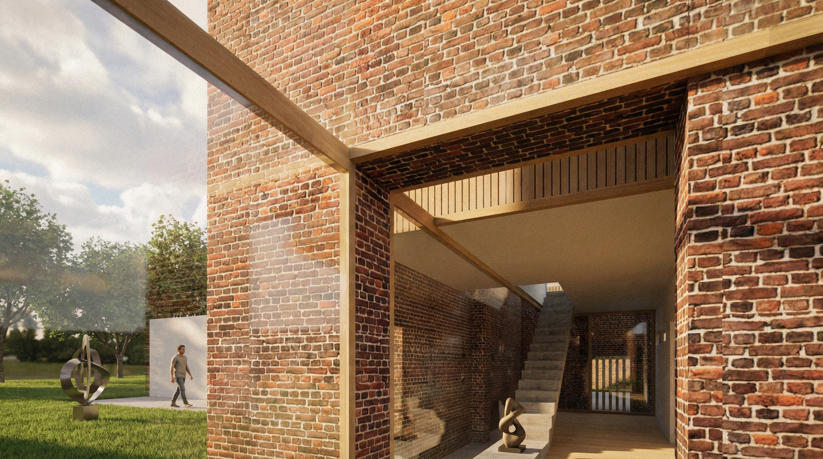 work as if you were a professional in creating 3d renderings for architectural projects without changing anything in the elements present in the original image make the visual of the new construction more realistic finally adjust the grain and lighting of the image to make it more cinematic leave the wood siding rendering as is keep the sky with some clouds retain the light and colors from the previous renders add a person add sculptures or decorations on the left of the stairs not in front add grass on the lawn surfaces do not change the other surface renderings