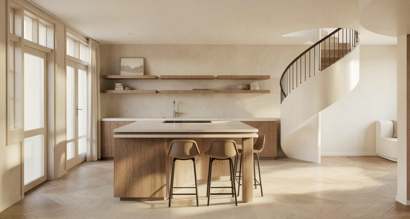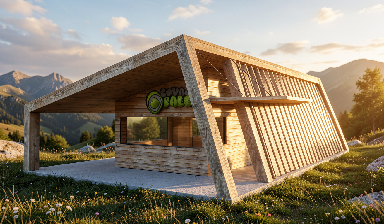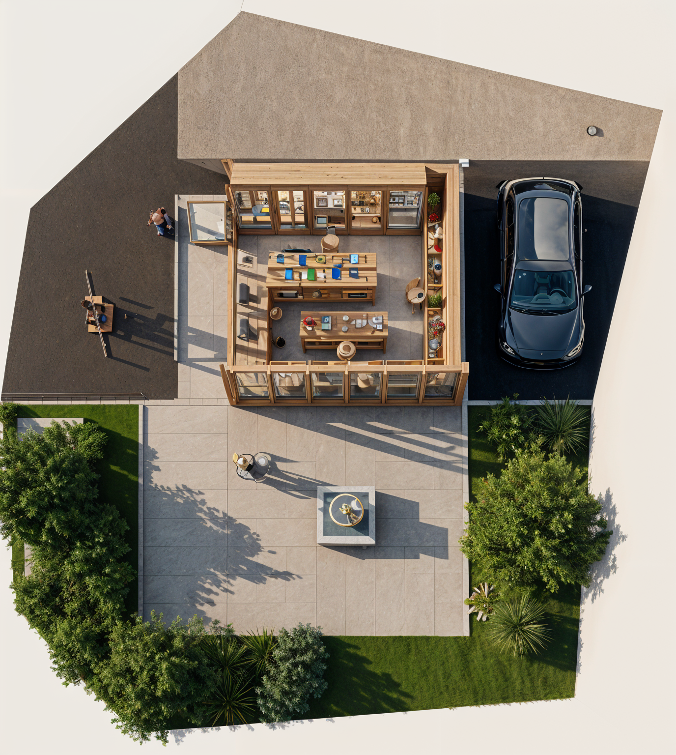 develop this plan 3d with a detailed representation of the interior showing food items on shelves and in refrigerated cabinets and people keep the exterior dimensions place a square fountain as in the plan with a round basin of the same size maintain the greenery of the ground next to the stone terrace where there is a car put asphalt and add a person arriving by bicycle leave the surface after the asphalt neutral
