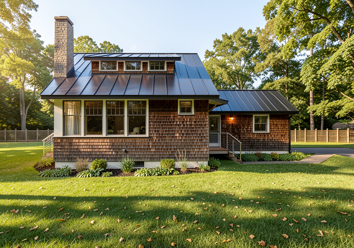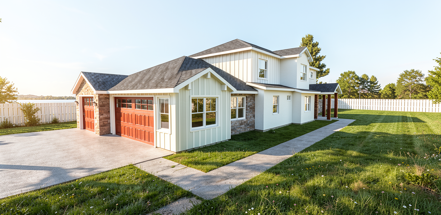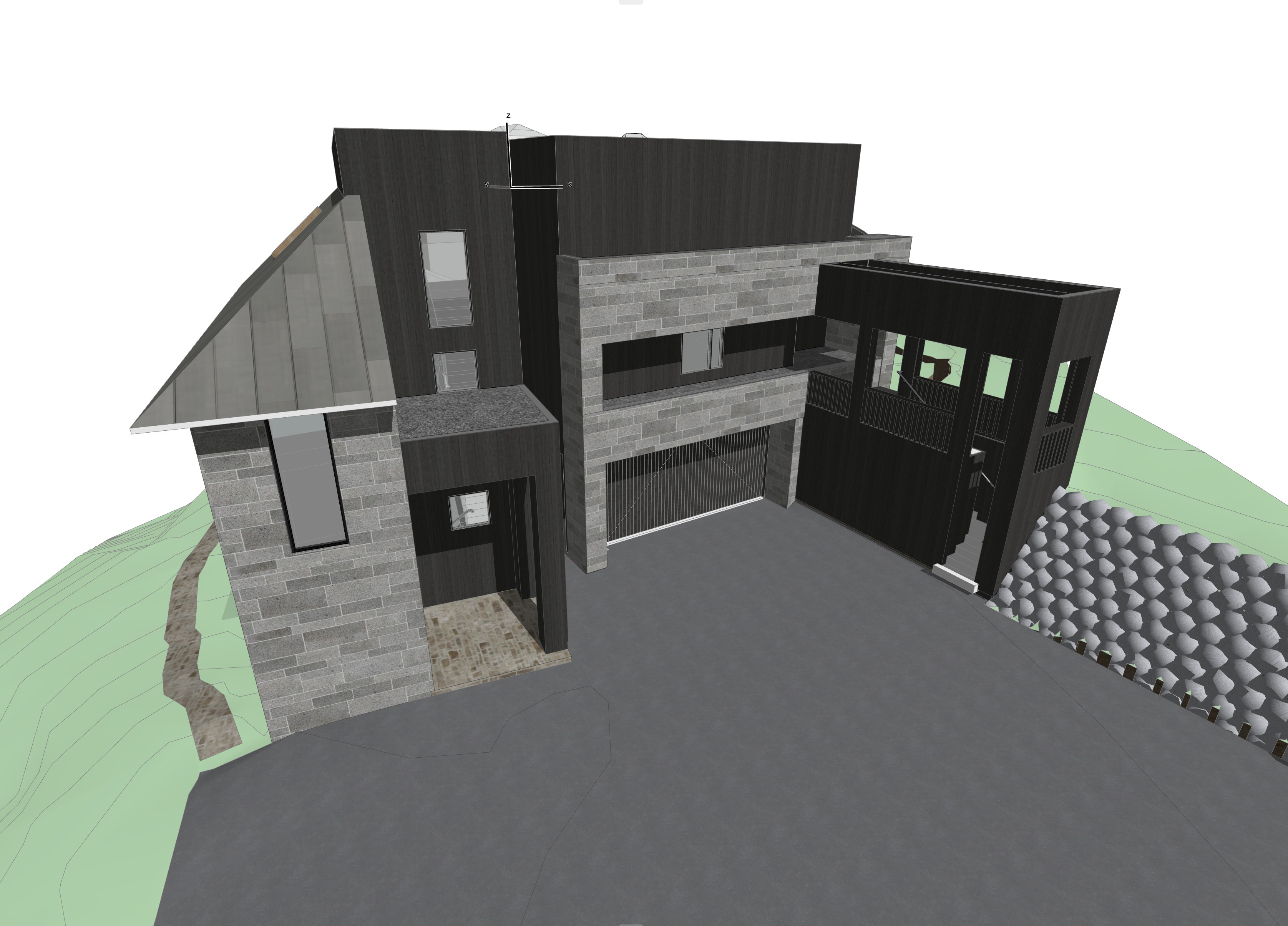 do not change the view enhance the current materials and make the landscape nicer vegetation generate with snow for winter conditions hyper realistic architectural visualization quality 8k resolution render a photorealistic 3d perspective of this house located in snowmass co reference the current material style just enhance material keep model geometry the same windows doors roof walls garage door pavement driveway make a lush vegetation that looks native to snowmass co