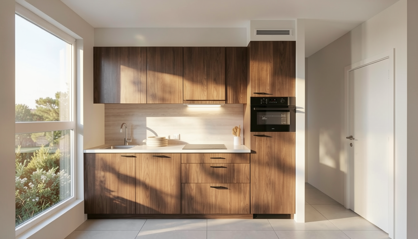 keep the stools but change the color and make it beige velvet add a balcony and a town outside the windows the kitchen counter top is also brown marble make the glass at the wine cabinet total transparent