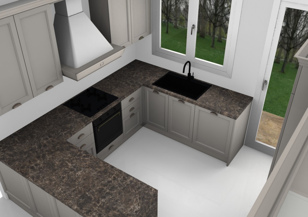 keep same colours of kitchen cabinets put wood floor decorate the worktop