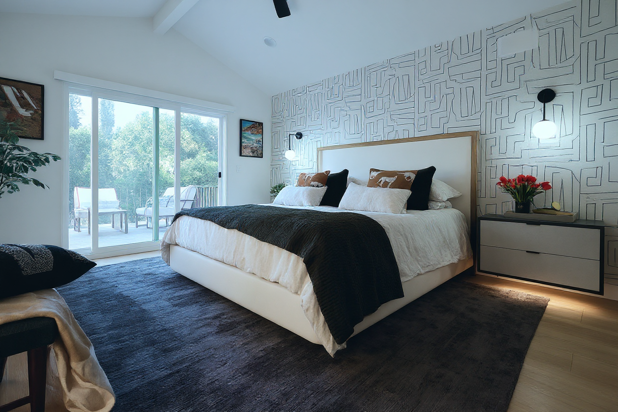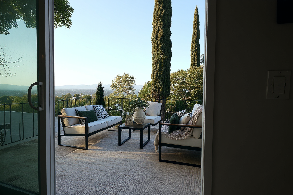 render image with white cement plaster walls and black posts and railings with cars parked in front add california native trees on a bright california summer day