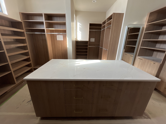add clothes hanging from the closet rods stage the shelves with shoes and purses add carpet to the floor put a chandelier hanging over the island and stage the island with jewelry clean up the bright sunlight