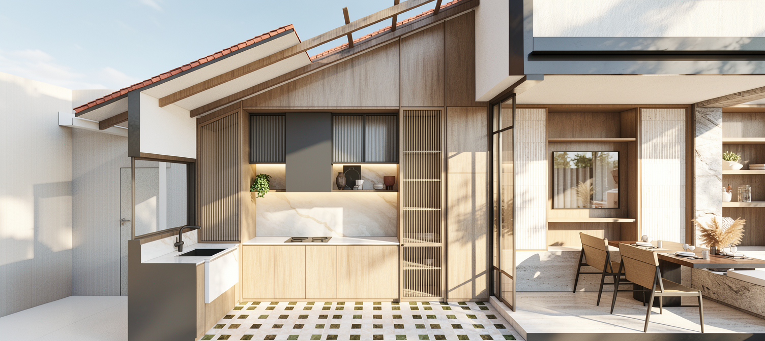 create a 4k mountain modern home with copper roof and gutters keeping the same colors add trees and just the tips of mountains in the background and landscape around the house less in the foreground