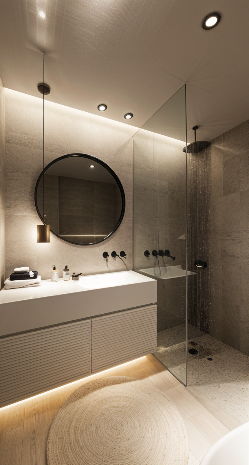 render a modern bathroom with a minimalist design the walls are textured in warm grey granite tones giving a soothing and natural look the ceiling features a plasterboard white in a mat finish reflecting soft light include a frameless circular mirror above the sink which is sleek and white with clean lines a pendant light hangs beside the mirror emitting a warm soft glow the floor is light wooden the shower has a glass partition with frameless the overall atmosphere is tranquil and elegant with soft ambient lighting highlighting the textures and shapes the bathroom furniture is white the height of the furniture is half of the one we see in the image the bathroom faucets are black glossy and the sink faucets are wall mounted the sink is white corrian mat material